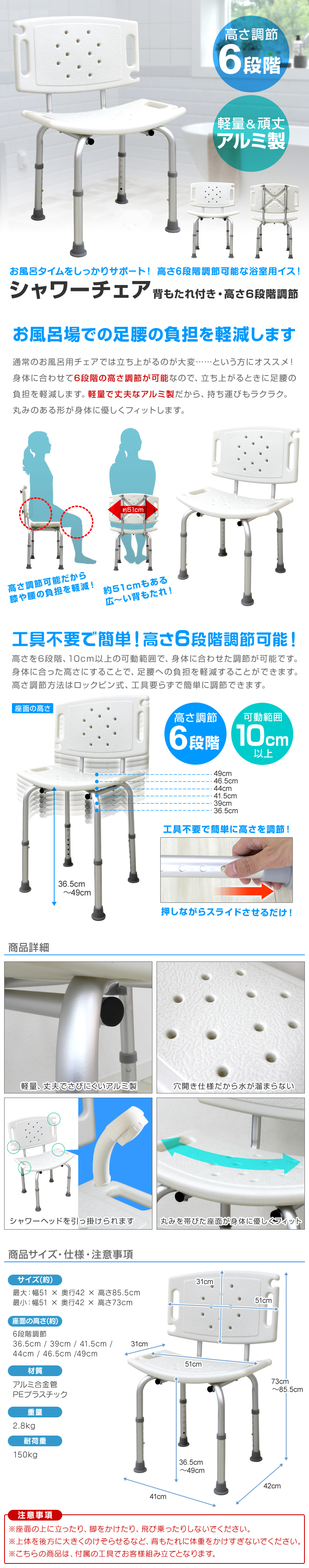 \ 膝や腰の負担を軽減!シャワーチェア / 通常のお風呂用チェアでは立ち上がるのが大変という方にピッタリです♪ 身体に合わせて6段階の高さ調節ができ、立ち上がる際の膝と腰の負担を軽減できます。 シャワーチェアの脚の先は滑りにくいゴム製になっているので転倒防止になります。 座面に排水穴があり、水がたまらないので清潔! 座面の持ち手は、立ち上がる時にギュッと掴んで身体を踏ん張る時に便利! 膝や腰が痛い方にオススメなやさしい設計になっています。 フレームは丈夫なアルミ製で、丸みを帯びた曲線が身体にフィット感をもたらします! 軽量なので、移動するときもラクラクです。 【商品コード】HBC001WH 【仕様】 カラー:ホワイト サイズ:(約)幅510mm×奥行420mm×高さ730~855mm 座面の高さ:(約)365mm/390mm/415mm/440mm/465mm/490mm(6段階調節) 重量:(約)2.8kg 使用体重制限:最大150kg 素材:アルミニウム、ポリエチレン 他 【注意事項】 ・座面の上に立ったり、脚をかけたり、飛び乗ったりしないでください。 ・直射日光またはストーブ等の熱は避けてご使用ください。 ・本製品を改造、分解しないでください。 ・本製品を用途以外で使用しないでください。 ・使用中にガタつきなどがみられる際は、ネジを締め直してください。 ・商品は、モニターによって色合いが異なって見える場合があります。 ・仕様・デザインは改良のため予告なく変更することがあります。 【もちろん新品未使用品です】 ▼検索ワード 風呂椅子 介護 バスチェア シャワーチェア 背もたれ 背付き 風呂いす 風呂イス 高さ調整 伸縮式 アルミ製 軽量 介護イス 介護チェアー 入浴用チェア お風呂 椅子 浴用 シャワーチェアー 介護用品 入浴補助 入浴介助 転倒防止 入浴 浴室 お風呂場 老人 便利 便利グッズ 妊婦 プチギフト 30代 40代 50代 60代 70代 80代 実用性 |