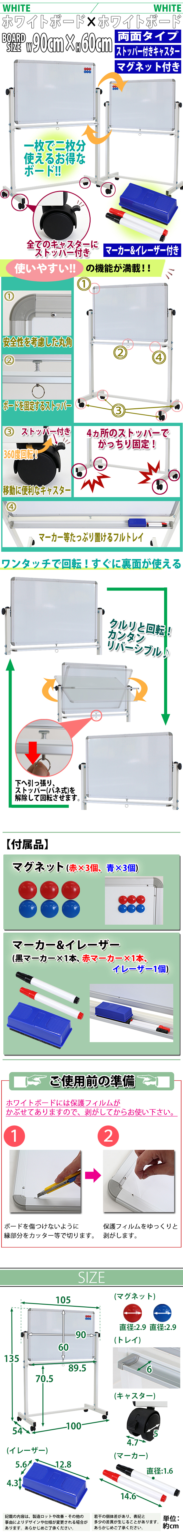 | 商品名 | 送料無料 新品 ホワイトボード W900xH600 両面 エコノミーモデル マーカー イレーザー マグネット付 ストッパー付キャスター 回転式 がっちりフレーム 900x600 90x60 トレイ付き スタンド 脚付き 足付き アルミ枠 白板 スチール 掲示板 オフィス 9060wwst |