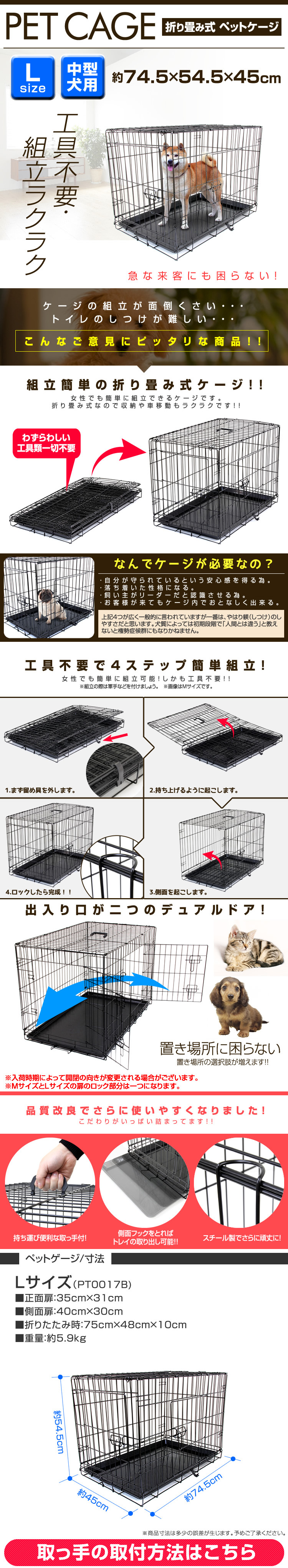 お留守番や、しつけに最適! 移動に便利な折りたたみ式ペットケージ。 本体はネジ等を一切使用せず、パタパタっと開くだけの簡単組み立て式です。 折りたたむことができるので、使わない時の収納や移動する時もラクラク! 日頃からケージを自宅で使用し、ワンちゃんも使い慣れることで、お出かけ先でも安心して休むことができ、ストレスの軽減にもつながります。 留守中やワンちゃんから目を離す時、いたずらによる怪我や事故の防止にも役立ちますし、緊急時の避難用にも重宝します。 【商品仕様】 カラー:ブラック サイズ(約):45cm×74.5cm×54.5cm 材質:スチール、ABS樹脂 重量(約):5.9kg 参考サイズ:柴犬 等 【注意事項】 ・こちらの商品は中型犬用のケージとなります。 ・ご注文時サイズは必ずご確認ください。 ・参考サイズはあくまで目安です。 ・本製品は屋内専用です。屋外で使用すると錆や変色の原因となります。 ・サイズ間違い、イメージとの違いによる返品、交換は一切行っておりません。 ・海外製品で、簡易梱包での輸入のため風防に擦れや多少の小キズなどがある場合がございますが、商品自体には問題ありませんのでご了承下さい。 ・仕様・デザインは改良のため予告なく変更することがあります。 |