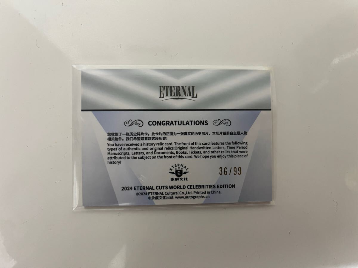 あなたは歴史遺物カードを入手しました!このカードの表面には、以下の種類の真正かつオリジナルの遺物が掲載されています。手書きの手紙、当時の写本、手紙、文書、書籍、チケット、その他、このカードの表面に掲載されている人物に帰属すると考えられる遺物です。この歴史の一片をお楽しみください!