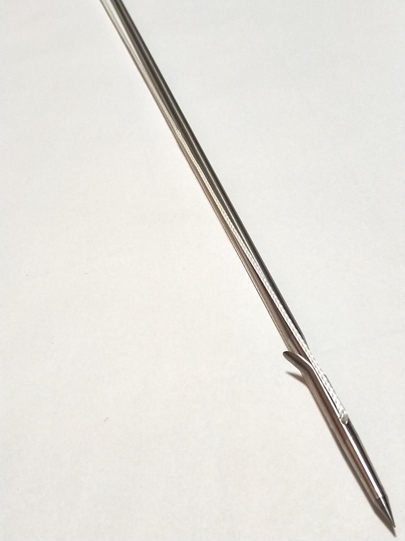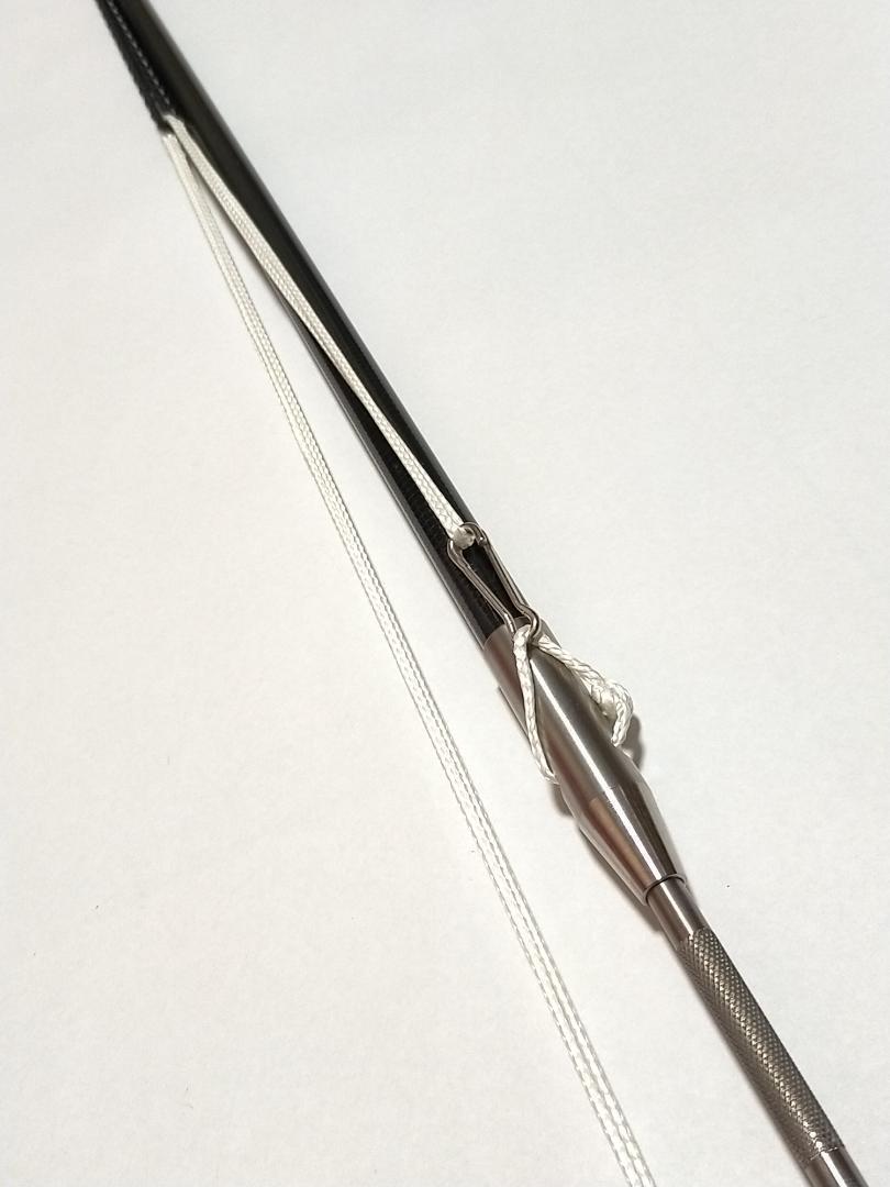 改良ポイント:先端の金具の穴を曲線にしました。根に隠れた魚を引き出すときにチョッキのダイニーマラインが切れた経験ありませんか??「あれ?そんなに引っ張ってないのに・・・耐荷重〇〇㎏って書いてあったのに!?」これはテンションがラインに掛かった状態で根にゴリゴリと擦れると丈夫なダイニーマでもたやすく切れるからです。命を守る登山ロープでも荷重がしっかりかかりピンと張った状態で岩肌にゴリゴリやるとだんだん切れていきます。この金具ではダイニーマが削れません。