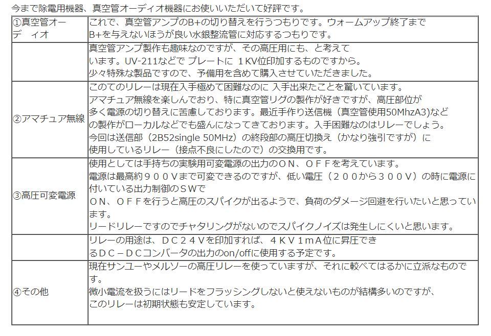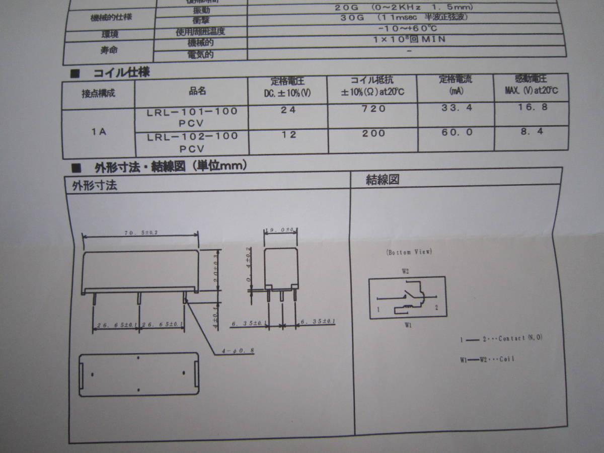 | リレーの用途は、DC24Vを印加すれば、4KV1mA位に昇圧でき るDC-DCコンバータの出力のon/offに使用する予定です。 |