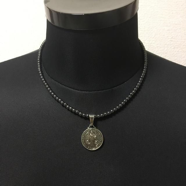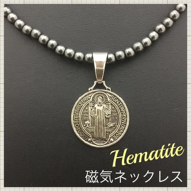 ヘマタイト 磁気ネックレス シルバーコイン シルバーメダル キリスト アンティーク風 パワーストーン シルバーアクセ ユニセックス 肩こり 健康