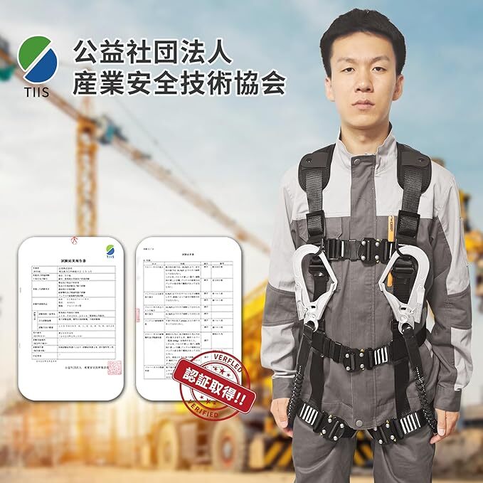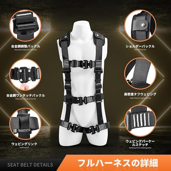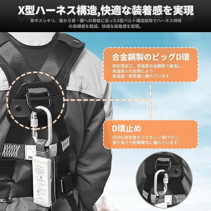 ・特徴:2丁掛け、伸縮式ダブルランヤード、ワンタッチバックル、肩パット付き