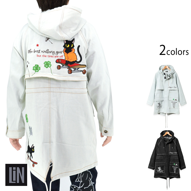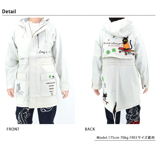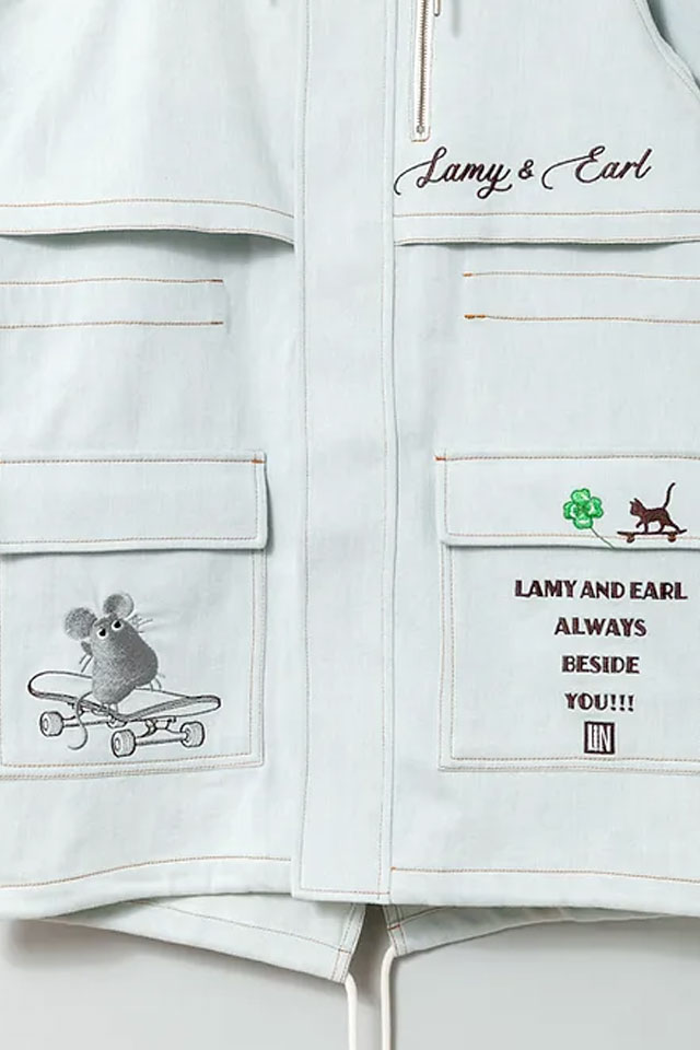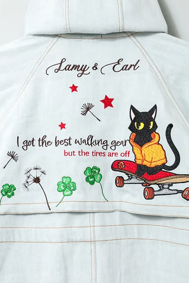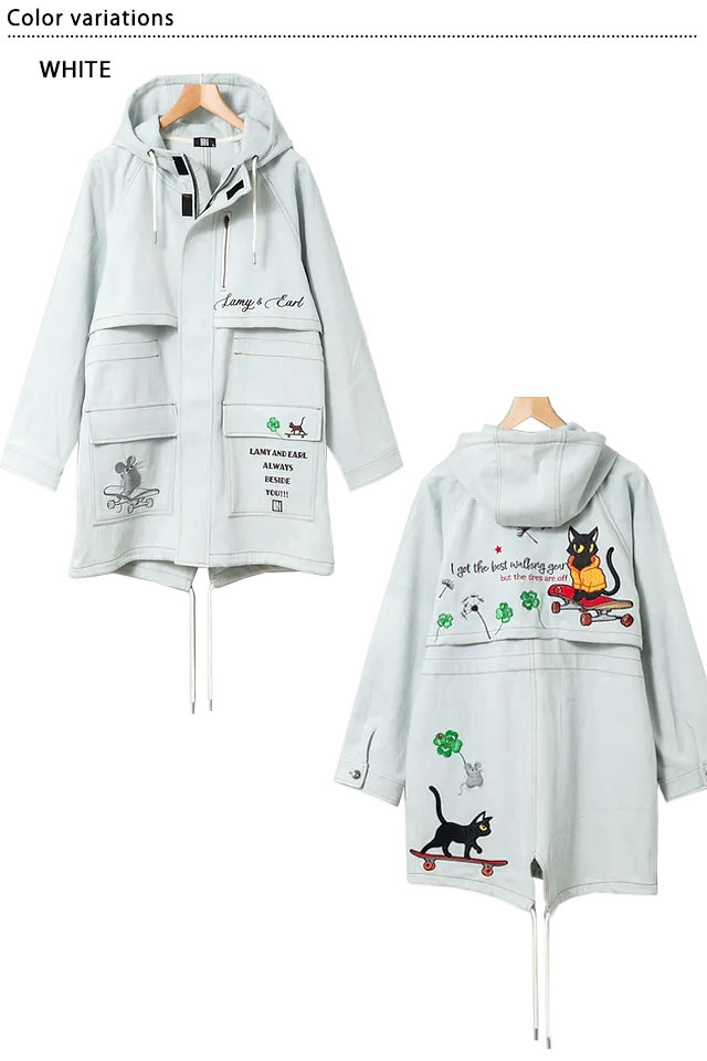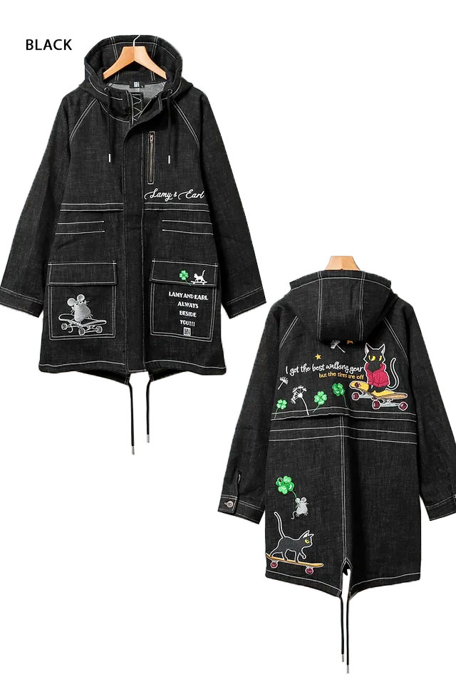 何でもあり、何でもやる新ブランド「LIN」から、ラミ&アール「最強のお散歩道具を手に入れた」総刺繍デニムパーカーロングジャケット(AL-75726)のご紹介です。 黒猫のLamy(ラミ)とネズミのEarl(アール)。 得意げな顔でスケートボードに乗っているラミ。 でもよく見ると、なんとタイヤが外れてしまっています。 最強のお散歩道具を手に入れたのは良いですが、果たして楽しいお散歩は出来るのでしょうか? ユニークなデザインを総刺繍で表現した、豪華なアイテムです。 ボディーには、しっかりとしたデニム生地を採用。 | ||||||||