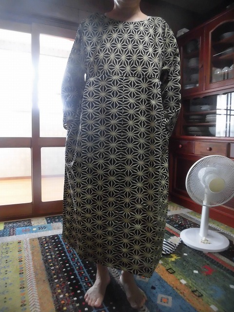 ★着物リメイク ワンピース 黒 麻の葉模様 ウール ポケット ハンドメイド★