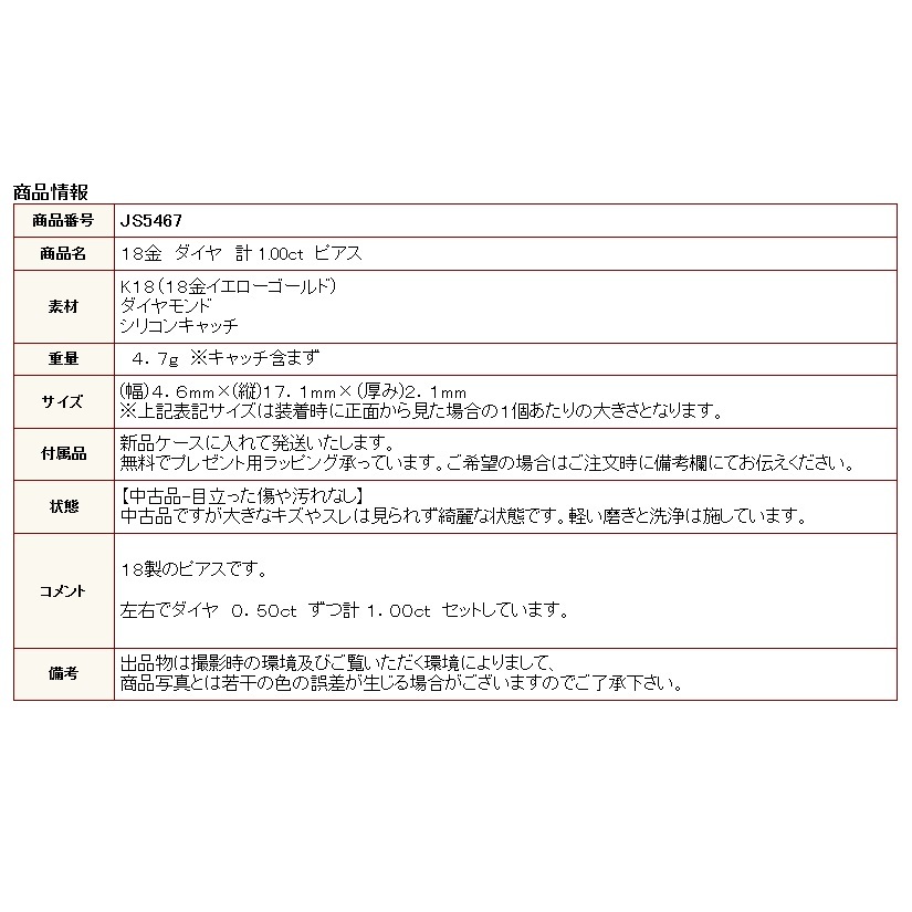 | 商品名 | 18金 ダイヤ 計 1.00ct ピアス |