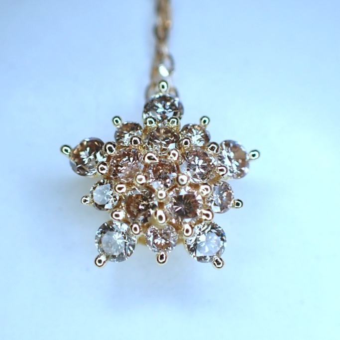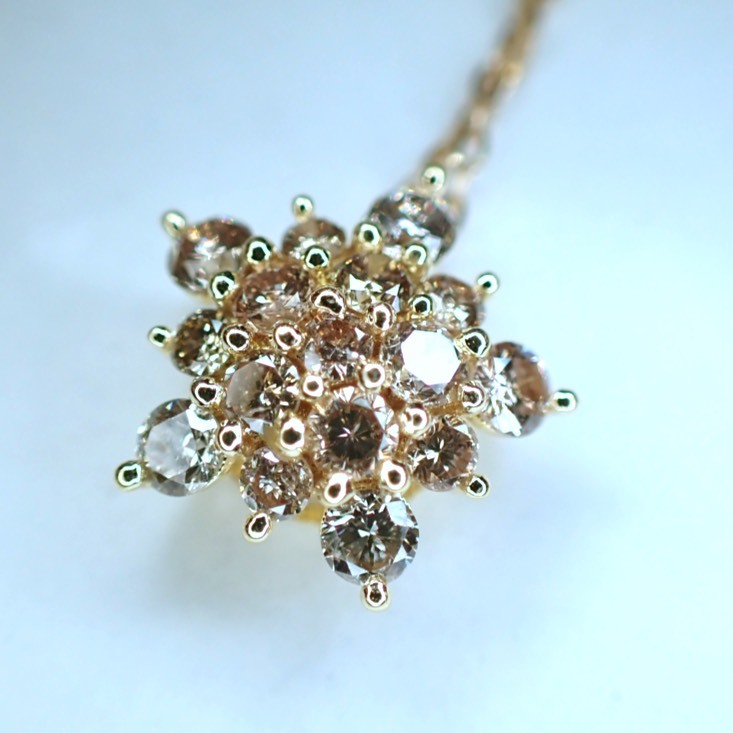 ブラウンダイヤモンドの石言葉は、「威厳」「カリスマ性」などです。 茶色は「神々しい逞しさ」という意味を持ち、不浄なものを寄せ付けない力を秘めているといわれています。日本人の肌の色にとても似合う天然ナチュラルカラーダイヤモンドゴールドネックレスでございます。令和のスーパーブランドの流行を取り入れて、空気のような付け心地のDesign、創りとなっております。取り外しのできるフリーアジャスタータイプの18金ゴールドネックレスが付属しておりますので、何かと役立つかと存じます。ダイヤモンドプロサービスの鑑別カード付。