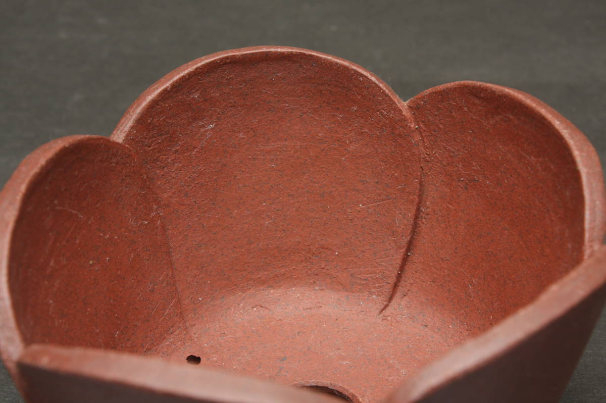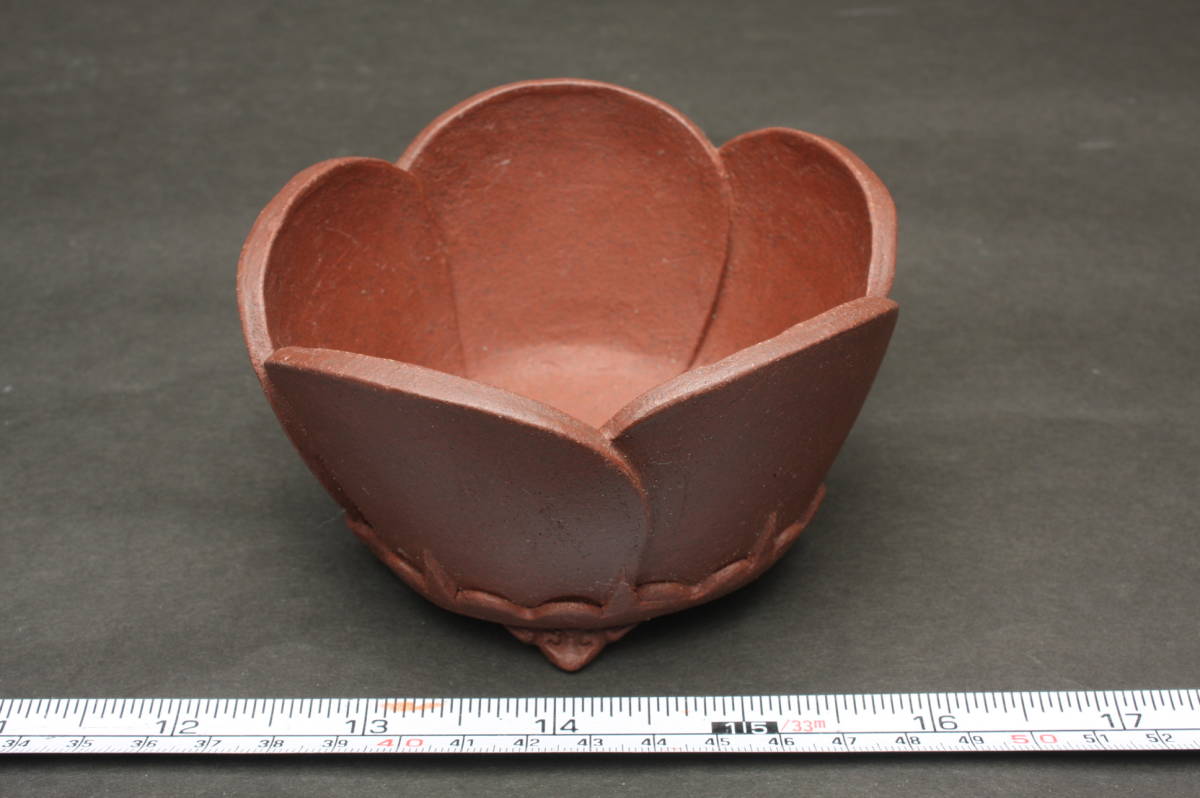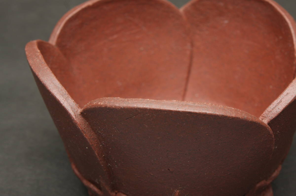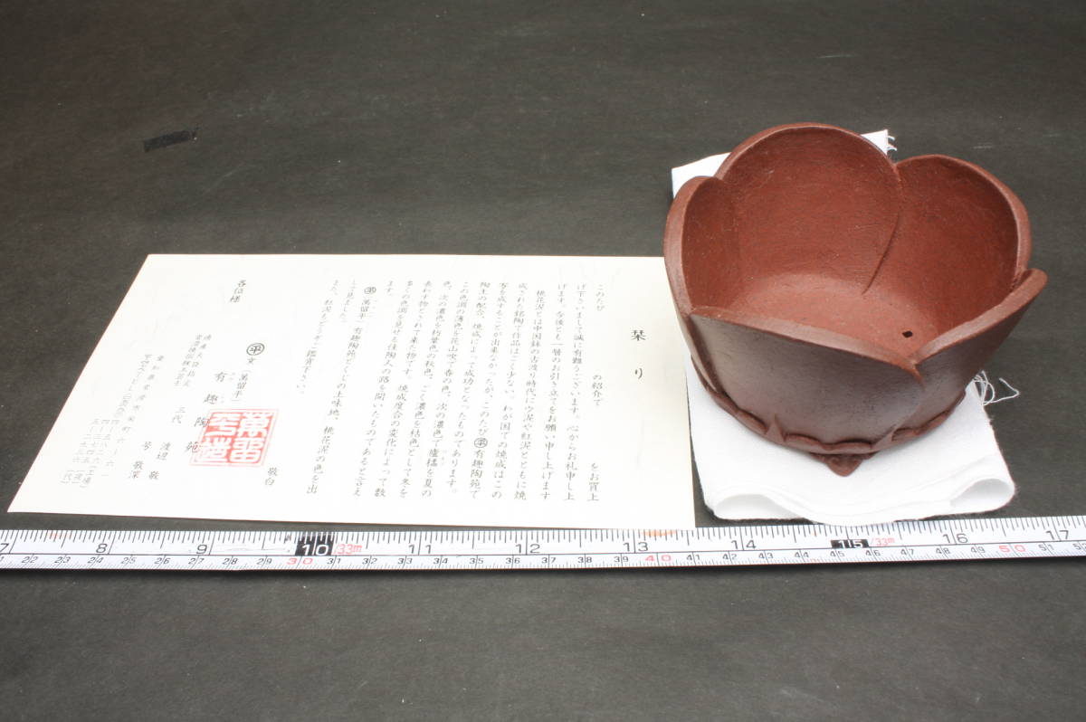 4100 明治26年 珍品 貴重品 杰作 径11 瑞宝章 渡辺敬深 萬留平 有趣陶苑 栞 朱泥 桃花泥 花型 花弁 蓮 苔鉢 豆鉢 ミニ盆栽鉢 鳥足