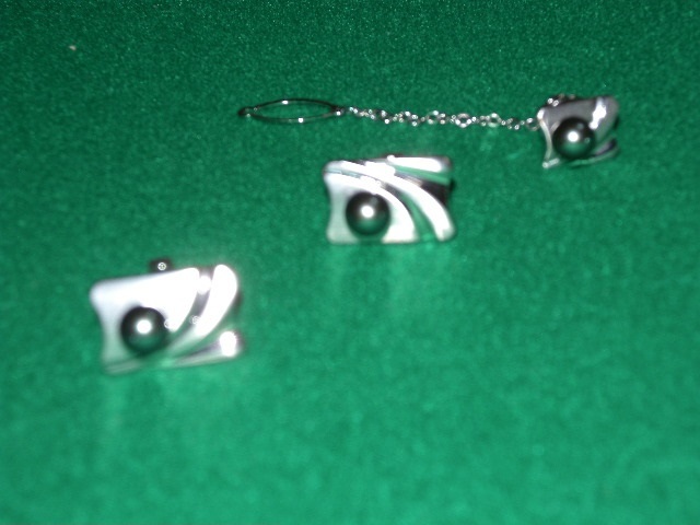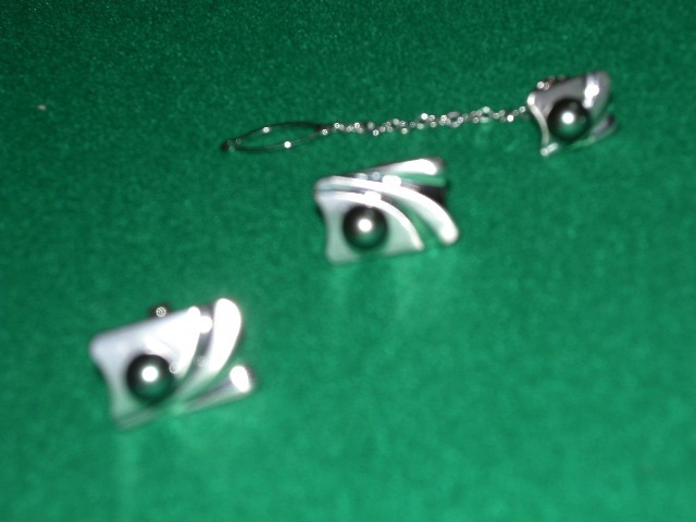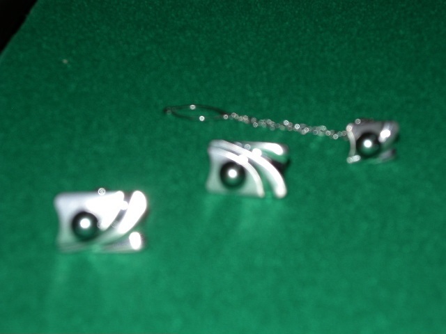 ~男のアイテム~ ブラックパール=カフス&タイピンセット、台はシルバーです。