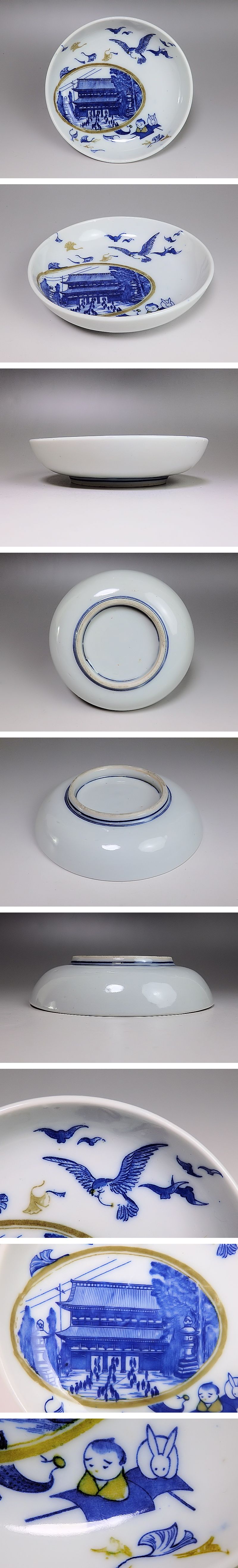 ★華心★ KKh 伊万里 印判 福助にうさぎ 鳥に銀杏の図 4寸皿