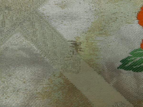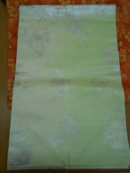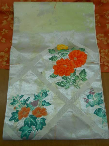 ・クリーム色~若草色地 オレンジ、黄、緑の糸で花模様