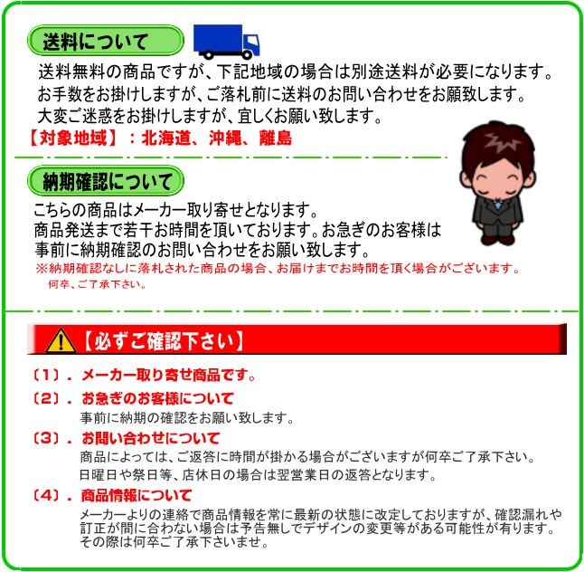 | 重量物や長尺商品につきましては、お届先の道路状況やメーカー提携運送会社の 配送車両の関係でご指定ご住所まで配達が出来ない場合がございます。 該当商品をご落札予定の場合は事前に配送が可能かのお問い合わせを頂ければと 思います。 |