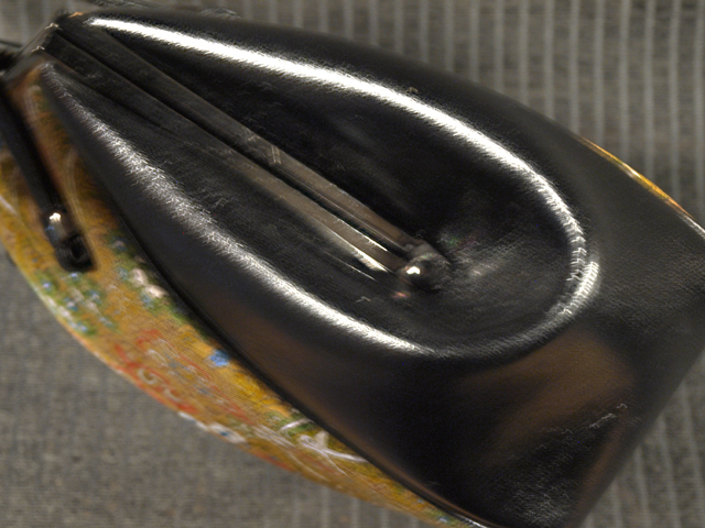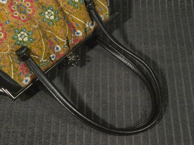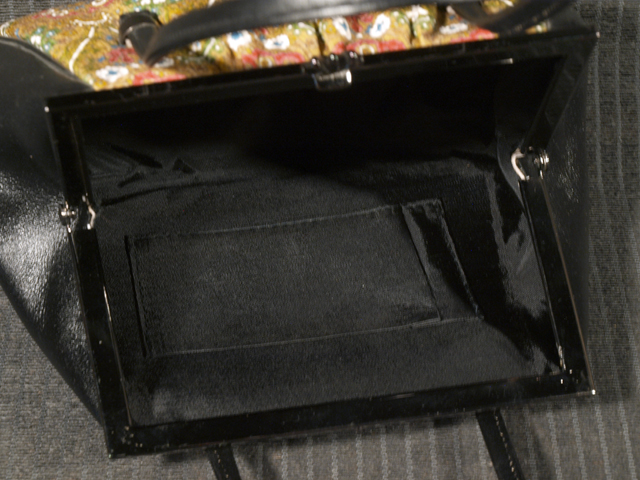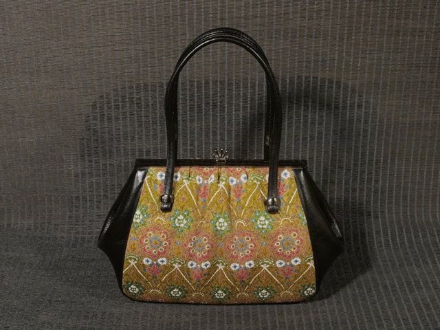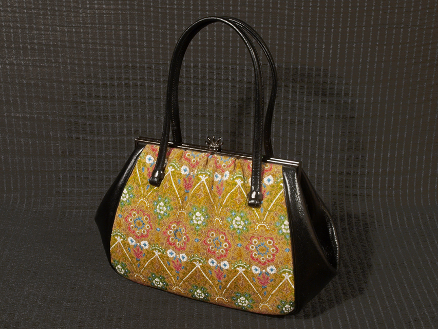全体的な印象としては山吹茶色といった感じの地に、更紗調の宝相華(ほうそうげ)の文様が染められている縮緬地と黒色の牛革地でつくられたハンドバッグです。 エスニックな意匠とヴィンテージな趣きが調和していておもしろみがあります。口金の留め具にも現代のものにはないかわいらしさが感じられます。 ユーズド品としてはいますが、使用感は感じられません。口金に直径約 1-2mm の小キズが 2、3 か所あるほか、底面にこまかな凹みが 1、2 か所ありますが、あまり目にはつかず、気にはならなさそうです。またバッグ内部の片方の内ポケットの口のチャックが経年により劣化しており、開きません。そのほかに目につく大きなしみやよごれ、褪色などのダメージはないので、気にされない方であればお使いいただけそうですがが、上記のとおり、片方のポケットがあきませんので、状態ランク=「D」のご使用対象外、リメイク素材用とさせていただきます。 |