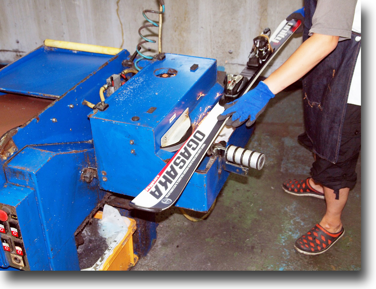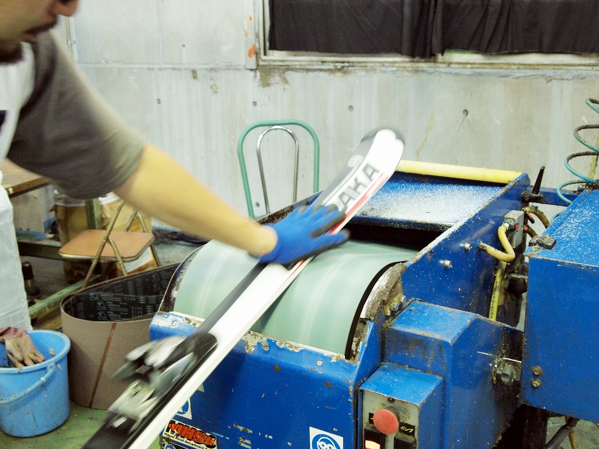 ●滑走面のノーズからテールまで均等に研磨し、ダメージのある古い滑走面を取り除きます。古くなった表面 を薄くスライスするイメージです。スライスの厚みはソールやベースエッジのダメージに応じて調整します。凹 凸のあるソールはこの工程で、まずフラットに近づけます。またこの 工程で比較的浅いすりキズ、線キズを取り除きます。熟練を要する重要な工程です。 |