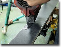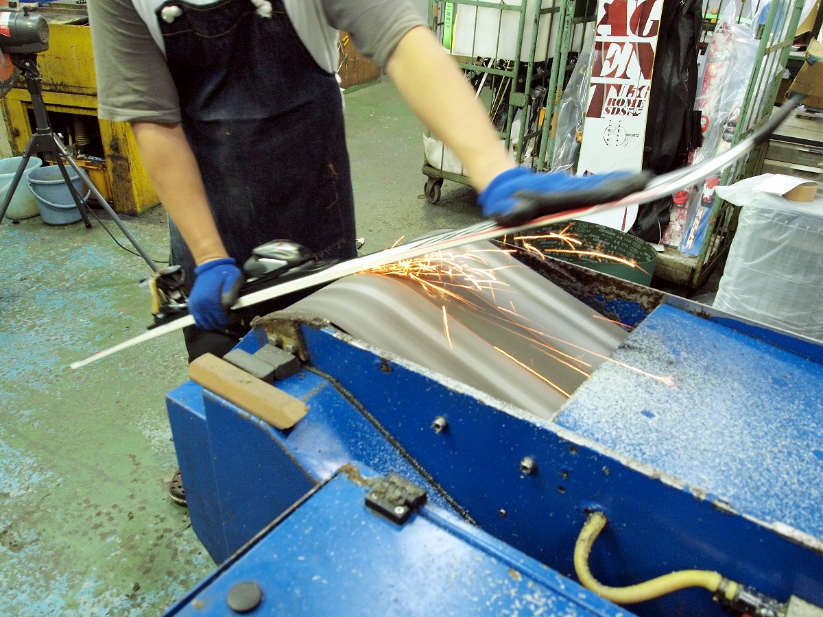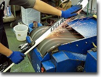 ●エッジに残ったバリを丁寧に取り除くとともにエッジの鋭調整を行います。当店はバフを使用せず、一台一台手作業でこの工程を行います。 これによってノーズからテールまで正確で均等なエッジの鋭調整が可能となります。エッジ防錆剤処理はこのタイミングで行います。 |