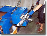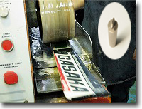 ●専用リペアマシン「エクストゥルダー」でキズを修復している画像。 えぐれた、深い傷には「ソールリペア」で対応します。リペア材料には滑走面と同じ[P-TEX」を使います。それ を250℃前後の高温で溶かしてソールに溶着していきます。修理した部分にもWAXが浸透する優れた補修材 を使用しています。 |