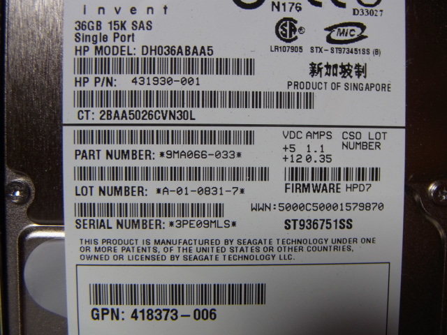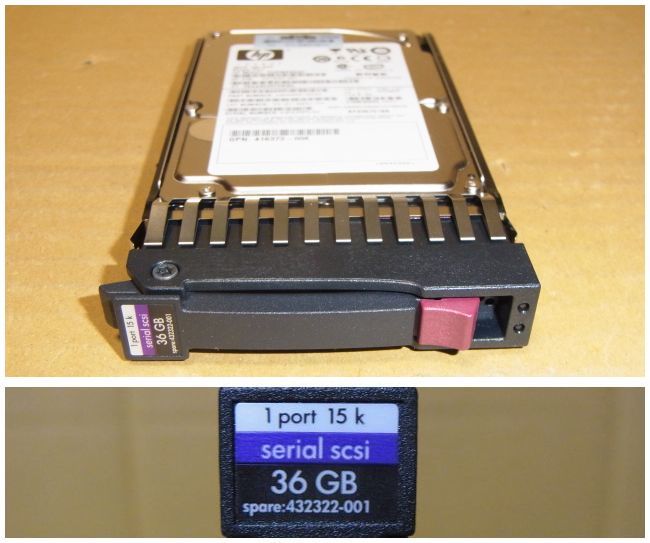 HPサーバ用マウンタ付き、2.5インチ 36G/15K/SAS HDD、中古・動作チェック済みです。