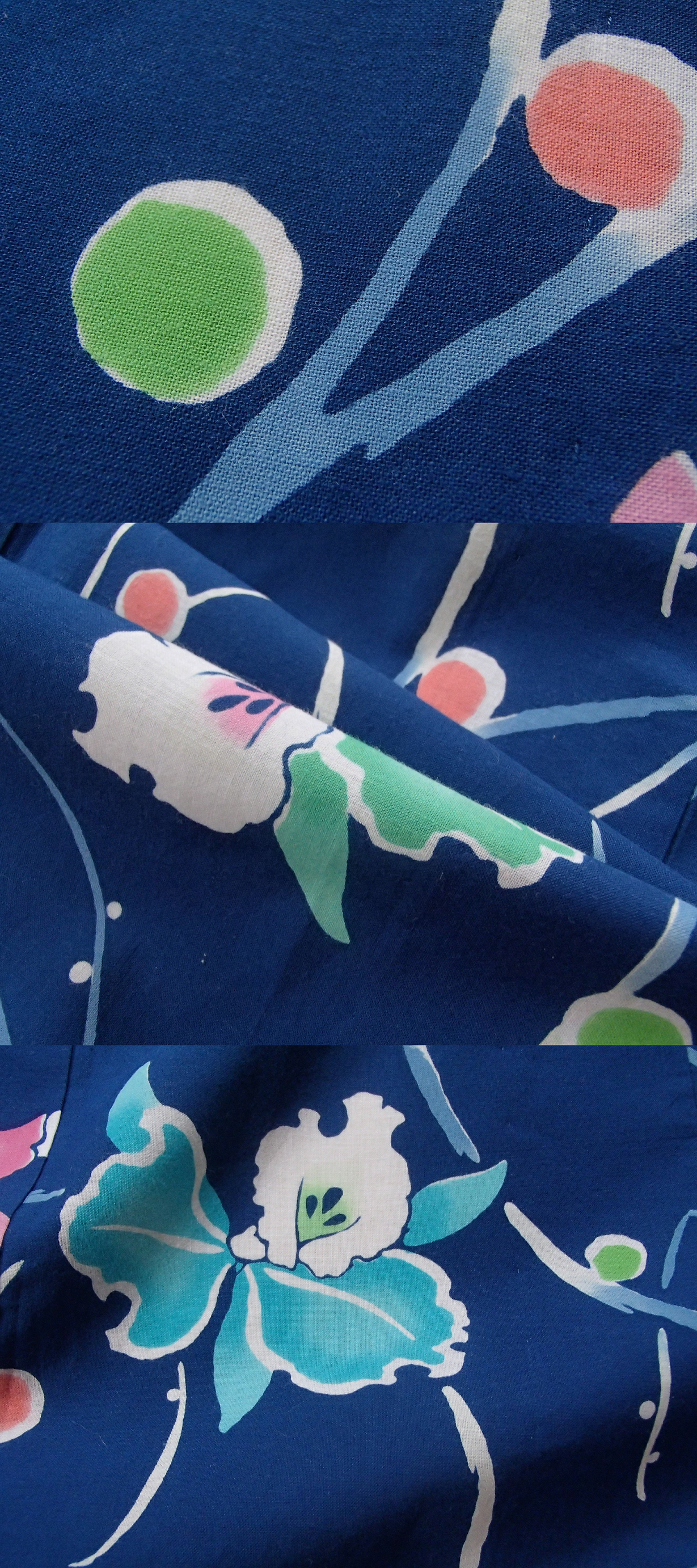 | 少し明るい紺地に水玉と蘭の花が、注染で染められたかわいらしい浴衣です。 | ||