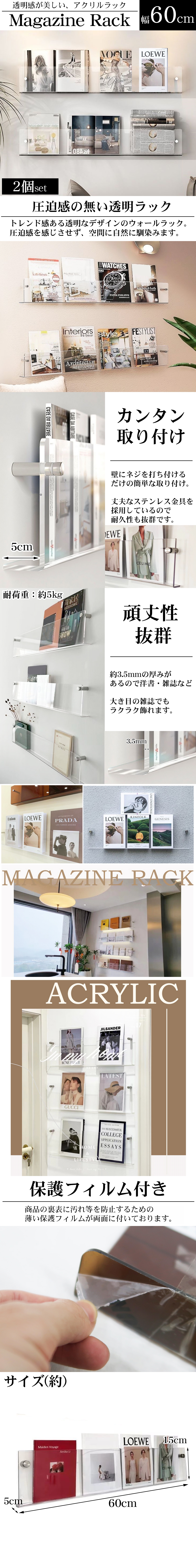 ウォールラック 壁 マガジンラック 2個set 幅60cm アクリル レコード 収納 ディスプレイラック 収納ラック 雑誌 薄型 ins風 透明 WP-66CL