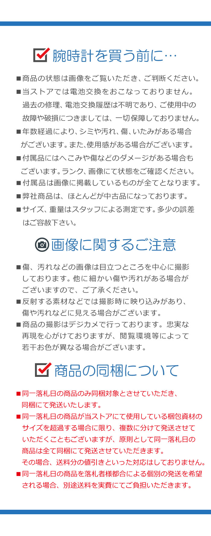 4.如果您的货品寄往日本本地,您在包裹签收前,请务必确认外包装是否有变形、破损、包装受潮、纸箱变色、纸箱重新封胶;商品是否破损、缺货。如有上述状况,您有权要求开封验货,以确认商品完整。如发现商品破损或少件,您务必用手机拍下破损情况,要求在快递单上写下实际情况且有权选择拒收,由快递公司来承担破损责任。并于当天告知我们,如未反馈,日拍网默认您货品完好,不承担任何责任。如果物品选择第三方物流(例如:第三方转运),请自行与第三方签订责任风险