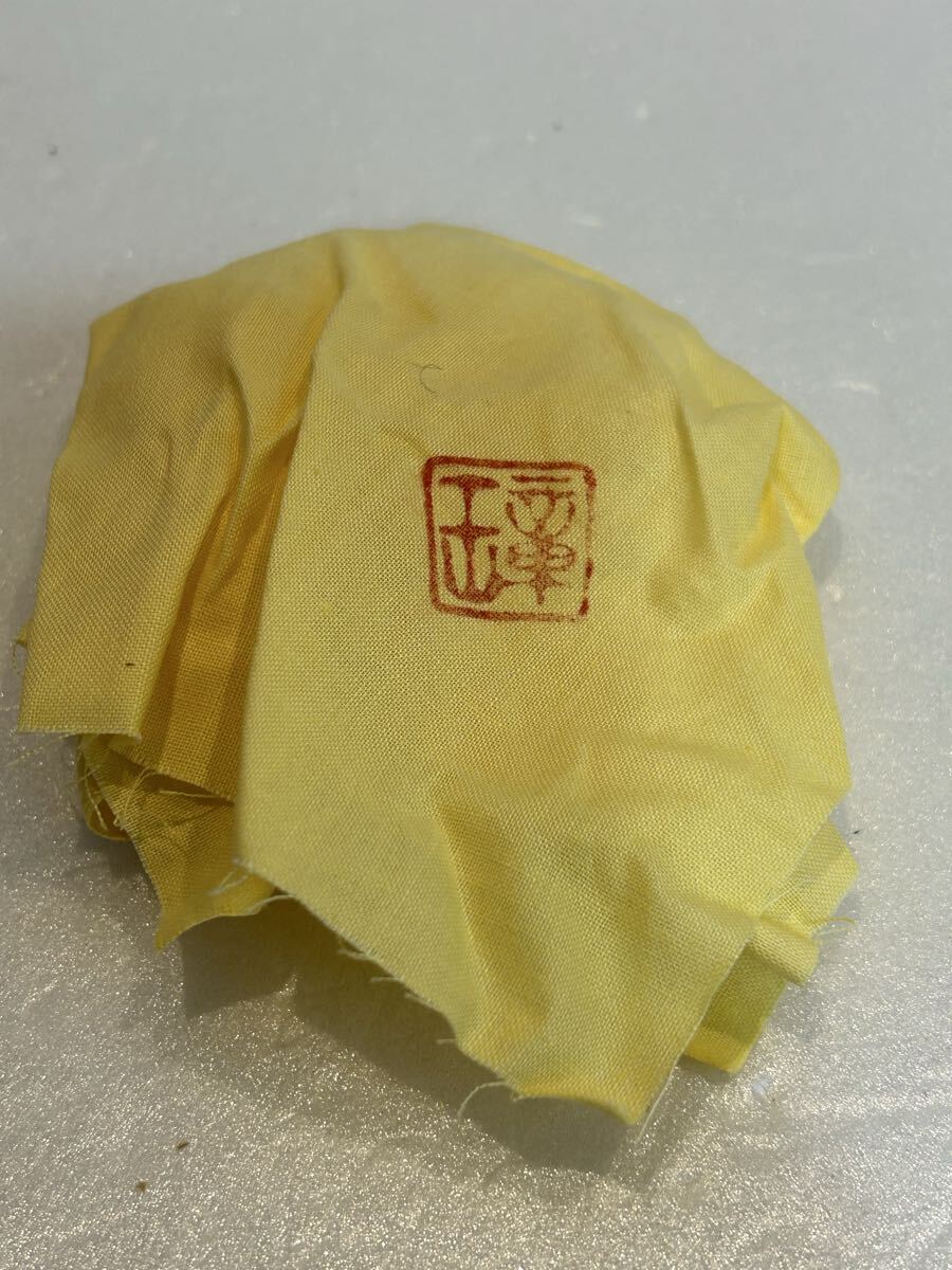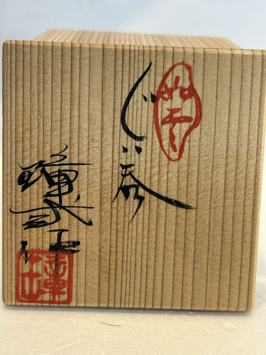 共箱には作家自筆の銘と印があり、共布・栞・販売店ラベル(画廊 菊)も揃った完品。