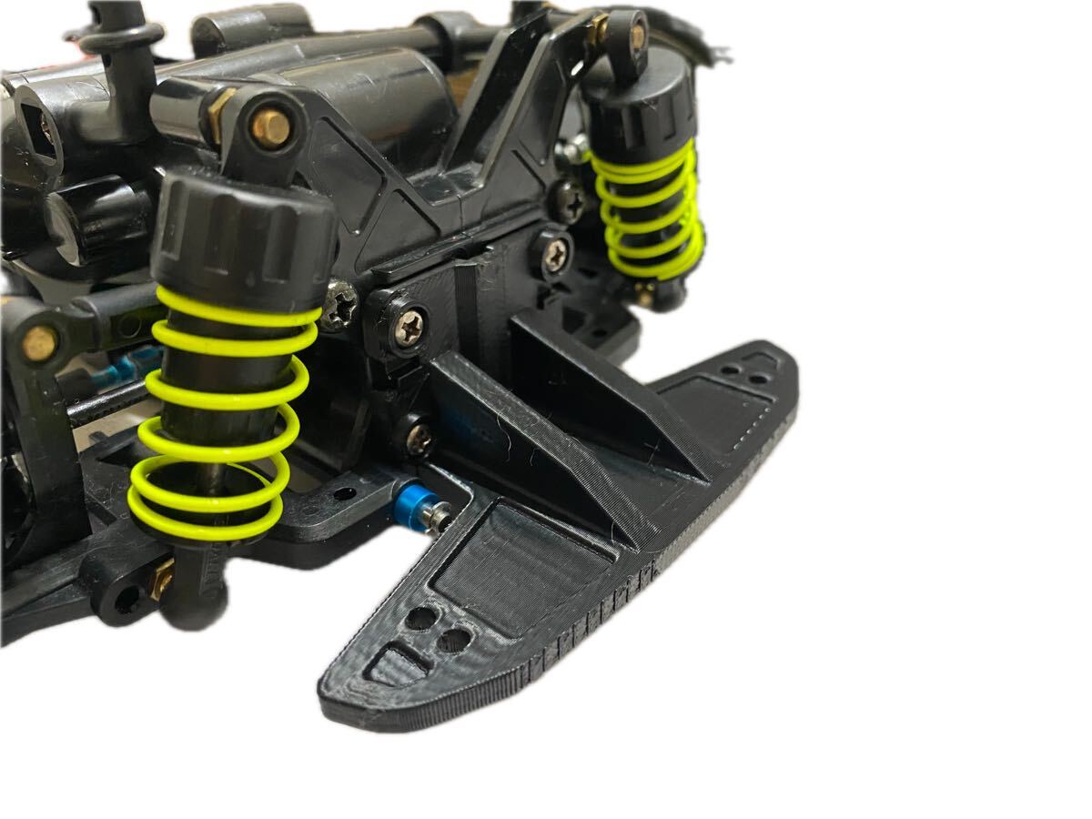 他ツーリングシャーシに比べて高い位置にあるバンパーを低い位置に持ってくることで、シャーシ単体での見た目がレーシーになり、ボディポストを移動させることも可能なバンパーてます。