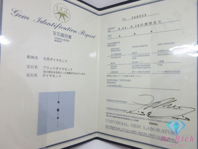 | 重量 | 総重量:約2.71g 【使用石】(カラット数/刻印) ブラックダイヤモンド:0.50ct / 0.50 ダイヤモンド:0.64ct / 0.64 | ||||