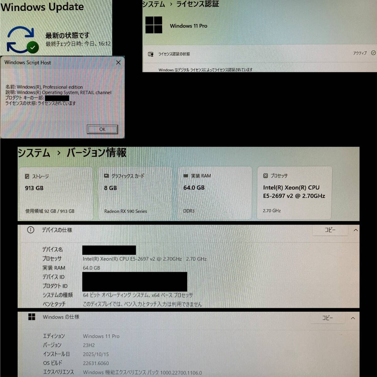 状態説明: 状態はそれなりかと思います。 外装が少しはげている箇所や、 傷がある箇所があります。 全体的にファンがうるさいので、 気になるなら性能や安定性と トレードオフで調整してください。 上面のファンは、 上面のスイッチでhighかlowの調整できます。 正面のファンは、 底面のツマミで調整できます。 底面のツマミとスイッチは 両面テープでの固定です。 詳しくは商品写真を参照してください。 商品説明: Xeon構成、多コア、メモリそれなりに積んだ 自作PCを出品します。 OSをインストールし、 (windows 10 pro 64bit 22H2をクリーンインストール →windows updateかける →windows 11 pro 64bit 23H2へアップグレードインストール) windows updateを あててます。 windows11非対応PCに、 マイクロソフトが用意している要件回避策講じて windows11入れてあるという点にご注意ください。 (マイクロソフトはwindows11非対応PCに windows11を入れることを推奨してはいないが、 禁止はしていないというのもミソです) windows11 24H2、windows11 25H2は 不具合が多く不安定なため、 敢えて、windows11 23H2を入れてあります。 メモリを8GBのものを8枚積み、計64GBという 結構な容量を確保しています。 CPUには、この世代のハイエンドCPUである、 intel Xeon E5-2697V2を搭載しました。 12コア24スレッド、 2.7Ghz(ターボブースト時は3.5Ghz)、TDP130W (CpuMarkというCPU比較サイトで、 i7 9700KF相当のスコア) となっております。 マザーボードは、Supermicroの、X9SRA。 現在でも妙に高い値段を維持しているマザーボードです。 (痂疲無い物なら、中古相場5000~くらい?(2025/10時点)) おそらく、windows XPに対応、 この世代のマザーボードにしては珍しいPCIスロット が付いており、 BIOSがまさかのLEGACY、UEFIのどちらにも対応可能と、 レガシー環境向けへの需要があるのではないかと 推測できます。 グラフィックボードは、 ゲーム面でのパフォーマンス考えて、 RADEON RX 590 8GBを積んであります。 一昔前の定番グラフィックボードであった GTX 1060 6GB と並ぶ位の性能がある、 グラフィックモデルがより多く必要になる環境では より優れることがあるグラフィックボードです。 注意事項ですが、どうやらこのグラフィックボード 結構、モニターやケーブルとの 相性問題が出やすいかもしれません。 問題発生タイミングは、長時間操作してないときの モニター電源切れから、復帰するとき。 画面の一部または全体が砂嵐になることがあります。 グラフィックボードのHDMI端子とモニターを接続時に 発生頻度が高かったです。 問題起こったとしても、 ケーブル挿し直しであっさり直ります。 接続モニターによって発生頻度が全然違ってたので、 恐らくは相性問題だと思います。 ひょっとしてグラフィックボード自体が 痛んでいるのではないかと想定し、 FF15ベンチを五回連続で周回させてみましたが、 それによって異常が起こることはありませんでした。 メモリとか痛んでるなら、この手の負荷掛けると、 何も映らなくなるとか、 常に異常な状態になるとかするものですが、 そんなことも無かったので。 構成からして、ゲームも動画編集も それなりにできるかと思います。 フルHDなら、 フォートナイトとVARORANTは余裕、 APEXもまあ遊べる。 FF15ベンチでもそれなりの性能が出ています。 動画編集全振りや、妥協無しな高いゲーム性能求めてたり、 配信者やりたいだとか、 機械学習や画像生成AI使いたいといった用途では あまりお勧めしません。 それらの用途の場合、要求を満たす性能の グラフィックボードの代金だけで 下手すればこの出品価格を軽く超え、 総額数十万掛かることを覚悟しないといけません。 AMDのRYZENで組むことと比べてのこのPCの利点は、 メモリスロットが8つあり、 比較的安く、多メモリ、多コア環境にできることです。 オマケとして、 windows 7 pro 64bit環境を PCに取り付け済のHDDの片方に入れてあります。 二つのうち、配線つながってない方がそれです。 ライセンス認証済です。 なぜ配線つないでデュアルブートにしてないかといえば、 windows updateの際に デュアルブートの構成情報が壊れて デュアルブートどころか、 OSの起動ができなくなるという よくある事態を防ぐためです。 windows 7 pro 64bit環境使いたい、 windows 7 pro 64bit環境使ってたが windows11 pro 64bit環境を使いたくなった場合、 PCを通常のシャットダウンではなくて、 完全シャットダウンさせ、 念のため電源ケーブル抜いてから、 HDDまたはHDDの配線を、ついてない方のSSDまたはHDDに付け替える ようにしてください。 SSD側がwindows11(上から三段目)、 発送時点で配線付いてないHDD側がwindows7(上から一段目)です。 |