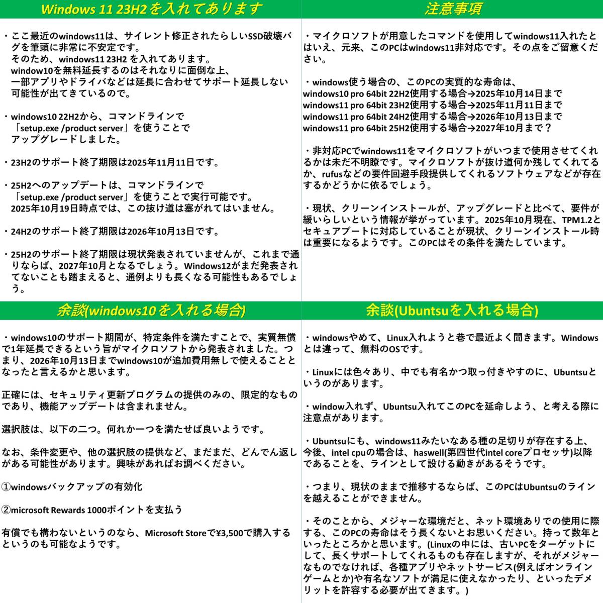 ・動作確認は、OS入れて動くかと、 windows updateかける程度の負荷 と使用時間で落ちないかどうかの 簡易なものであることを ご了承ください。 ・電源コード付属です。 ・ネット環境、無線LAN子機または有線LANケーブル、 モニタ映像用の線、キーボードとマウスとモニタを 用意していただければすぐ使えます。 ・疑問点などあれば、ご質問ください。 ・落札後のキャンセルは原則受け付けませんのでご了承ください。 ・ノンクレーム・ノンリターンでお願いします。 |