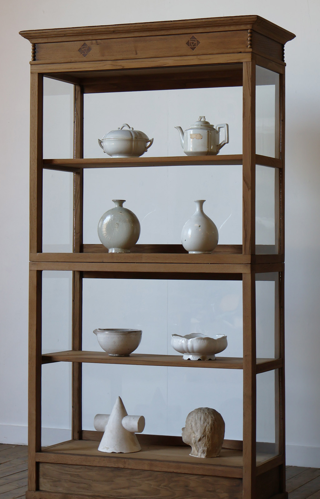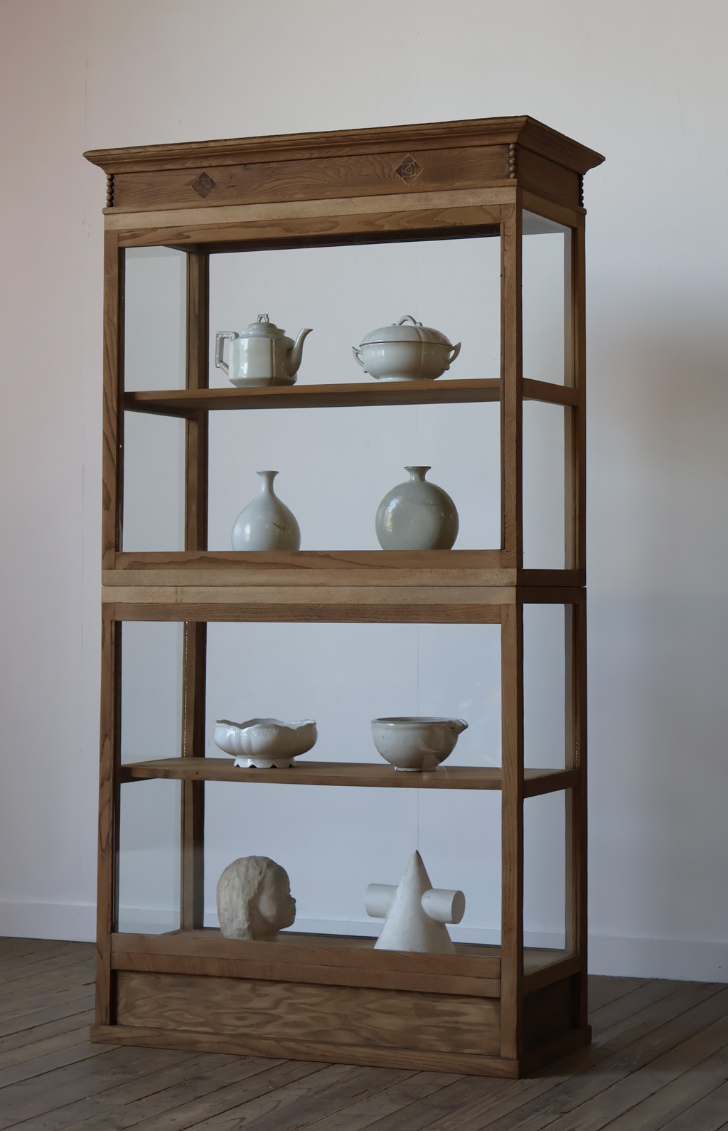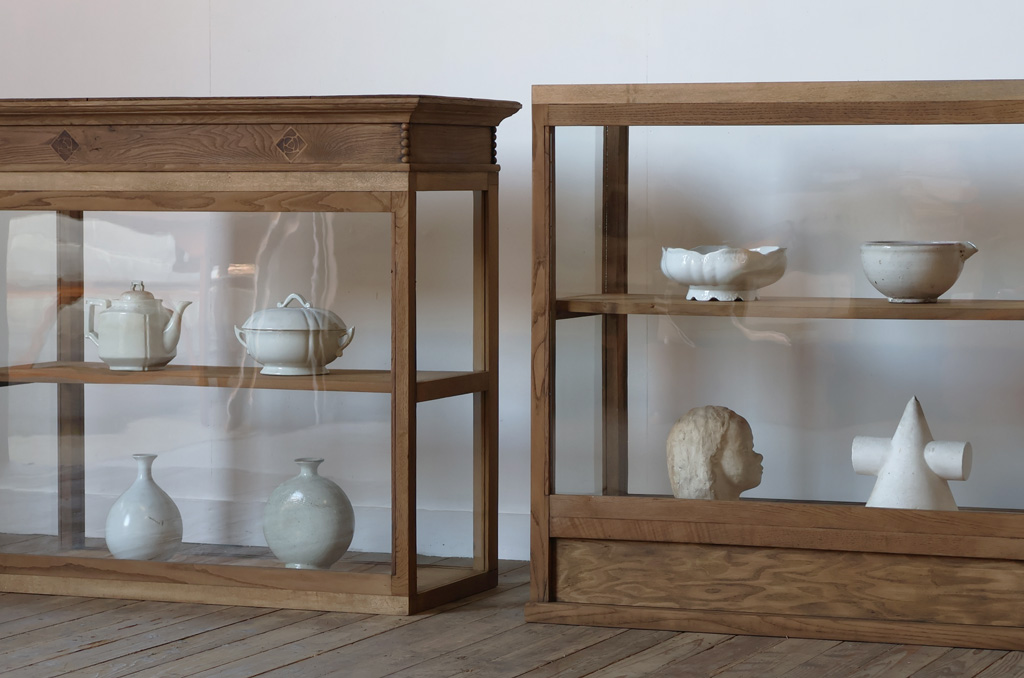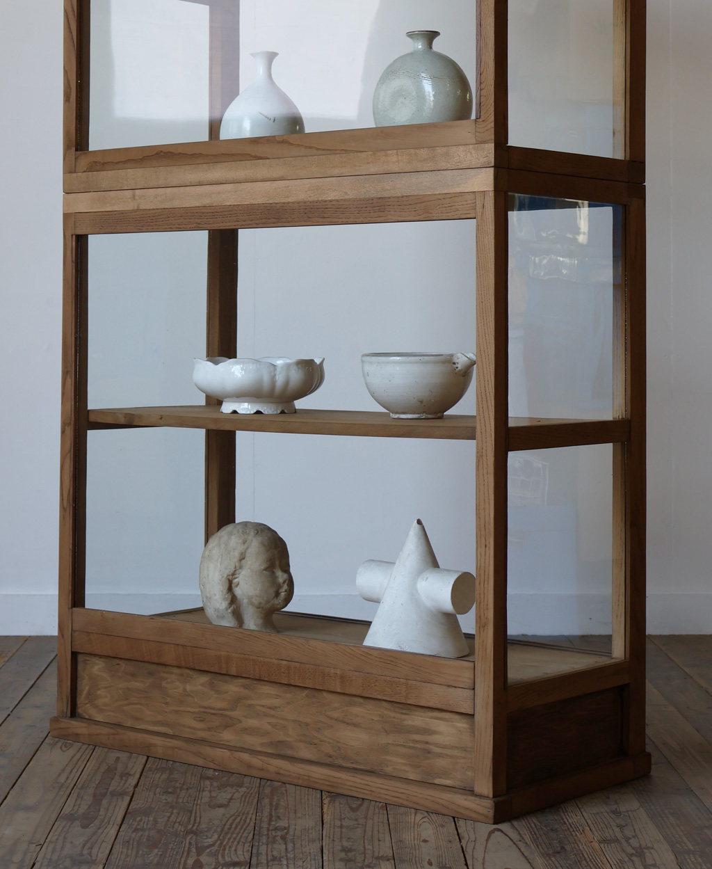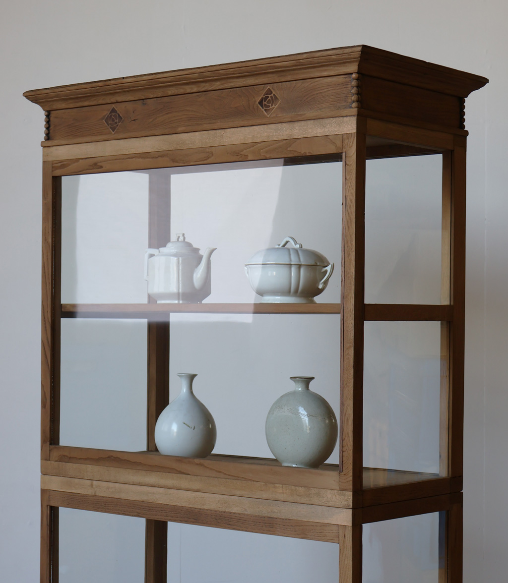 シンプルなグッドデザインで造りも良く、存在感があり、古い木枠の綺麗な木目がとても雰囲気の良いアンティーク重ね3面ガラスケースですので、店舗やギャラリー、カフェなどでの什器としてや、ご自宅でのコレクション展示ケースや食器棚などにいかがですか!オススメです!