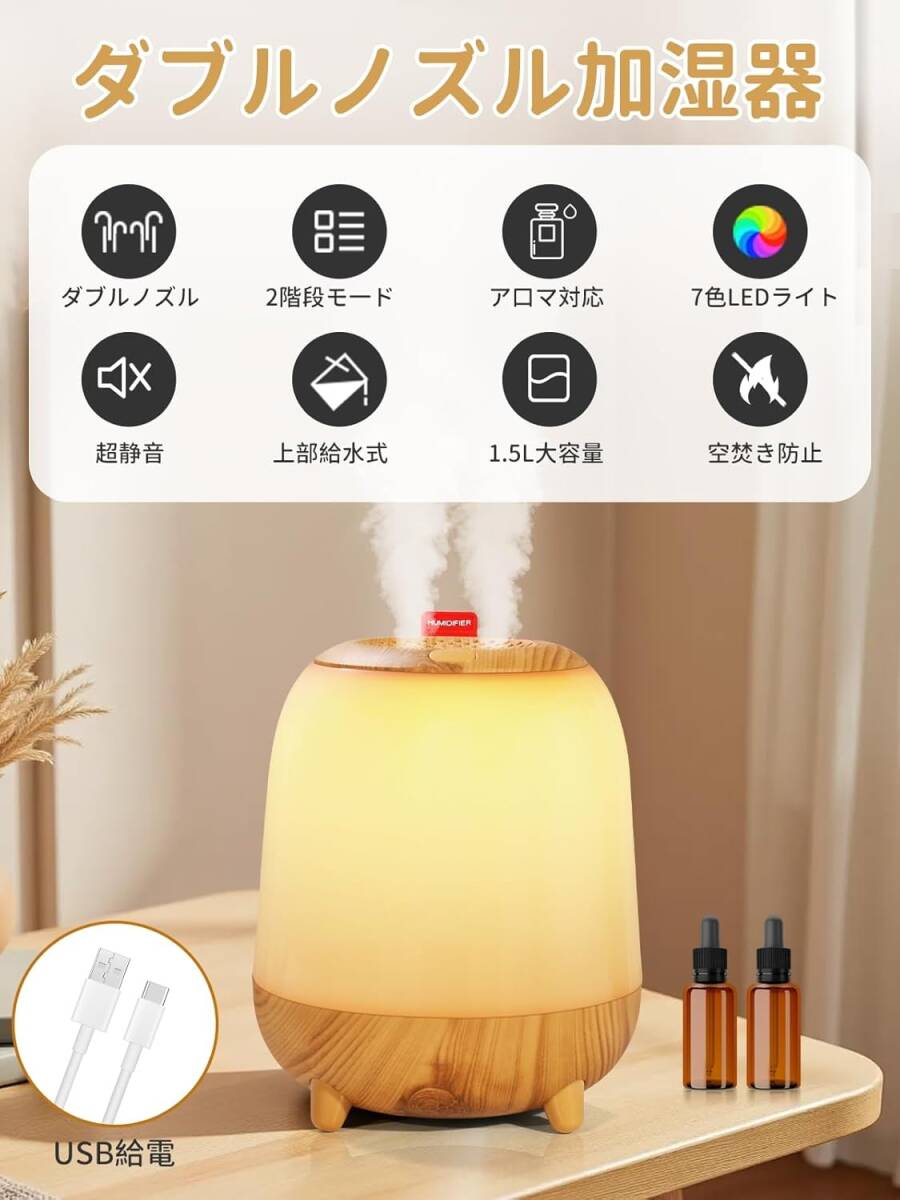 【木目調】加湿器 1500ML 大容量 超音波式 次亜塩素酸水対応 アロマ対応 7色LEDライト 6-10畳に対応 日本語説明書付き
