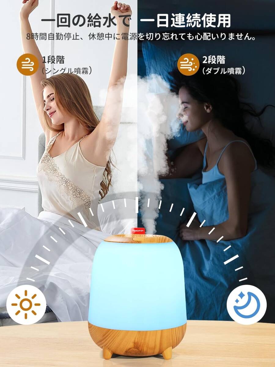【上部給水式&空焚き防止機能】加湿器は上から注水タイプなので、蓋を開けるだけで楽々注水でき、お手入れも簡単にできます(ぜひ普通の水道水を入れてください)。ワンタッチボタンの設計でだれでも簡単に使用できます。空焚き防止機能付き(連続加湿8時間後自動停止)、お子供やお年寄りがいる家庭でも安心してご使用いただけます。