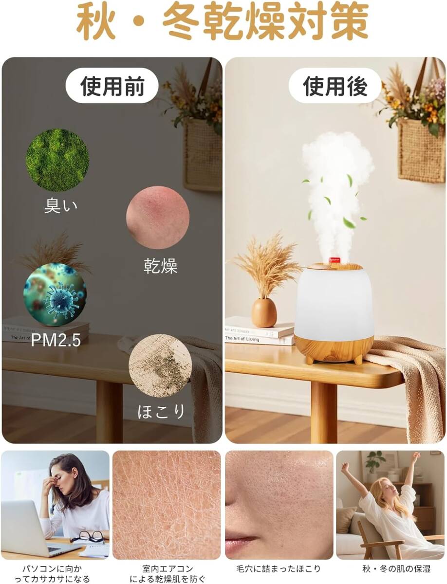 【パワフル加湿&一台多役】このダブルノズル加湿器は、向かい合った循環で、片側加湿の制限を解消します。細やかな霧が空気中で交錯し、素早く部屋全体を均等に加湿し、どこにいても快適な空間を実現します。加湿器としてだけでなく、アロマにも対応しています。「細やかな潤い」と「リラックスできる香り」が組み合わさり、心身をリラックスさせ、快適で静かな雰囲気を作り出し、睡眠を促進します。秋冬の乾燥、花粉アレルギー、喉の乾燥やかゆみ、肌のピリピリ感、静電気の悩み…これで守ってくれる!環境を長時間湿潤に保ち、乾燥による複数の不快症状を一度に解消し、心地よい秋冬をお楽しみください。