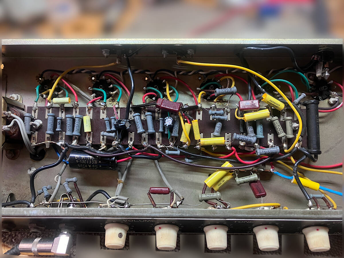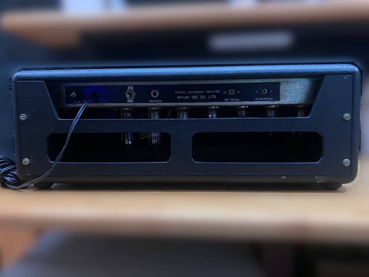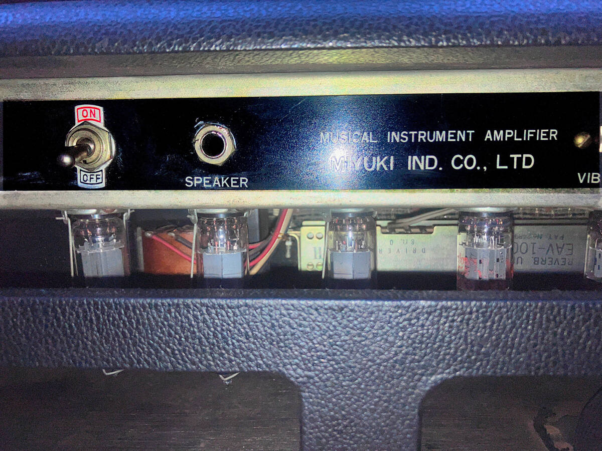 アンプは現在の状態で、リバーブやトレモロなしで簡単に使用できます。歪んだ音はこれは1960年代後半のビンテージ・エコー(後にエルクとなった)オールチューブアンプです。写真からもわかるように、古いコンデンサーは全てマロリー150コンデンサーに交換済みです。新しいカップリングコンデンサー、フィルターコンデンサー、バイパスコンデンサーが搭載されています。そのためアンプのサウンドは力強く、低音量ではクリーンで、音量を上げると滑らかに歪み始めます。トレモロ機能は全く動作しません。リバーブタンクを叩くと音がしますが、出力信号にはリバーブが反映されません。このため、本アンプはジャンク品として販売されます。