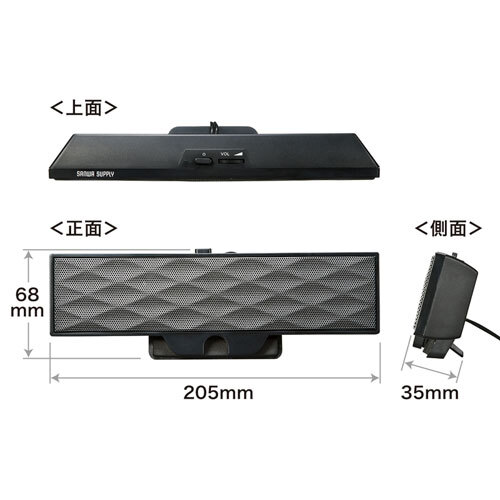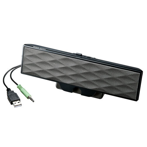 ※配送の送り主はサンワサプライ(株)と記載されています。沖縄・離島配送不可となります。 当店は正規販売代理店です。 特長 ノートパソコンやタブレットの画面上部に固定でき、USBケーブルで電源供給できるUSB電源方式のサウンドバースピーカーです。 様々な厚みのノートパソコンに装着できるクリップ付き、最大25mm幅まで装着可能です。 電源をUSBポートから供給するUSB給電方式のスピーカーです。AC電源を必要としないので接続が綺麗にでき、簡単に設置できます。 製品単体でも自立するため、ノートパソコンの横やデスクトップパソコンでのディスプレイ下などレイアウトは自由にできます。 音源出力は3.5mmステレオミニジャック接続でパソコンの音声端子につなぐだけで音楽を楽しめます。 ボリュームコントロールとパワーON・OFFスイッチが分かれているので、スイッチを入れればいつもの音量ですぐに音楽を楽しめます。 実用最大出力6W(3W+3W)でコンパクトなサイズながら迫力のある高音質を再生します。 メーカー保証期間180日 ※当店発注日からになります 気をつけておりますが、タイミングによっては在庫切れの場合があります。 仕様