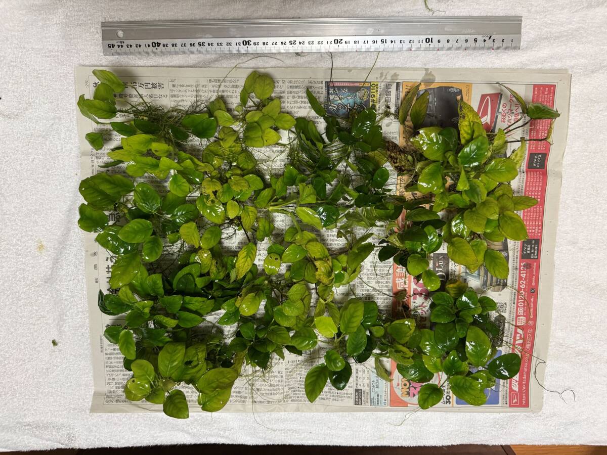 熱帯魚の水槽で増えました.写真のとおり,黄ばんだり穴があいた葉もありますが,活着して成長し,新しい葉が出てきて代謝していきます.写真の新聞紙に乗っているものすべてで1口とします.具体的な種類は不明です.木炭などに巻いて活着させて下さい.水槽にナナを敷き詰めてみたい,という方におすすめです.ノークレーム・ノーリターンでお願いします.