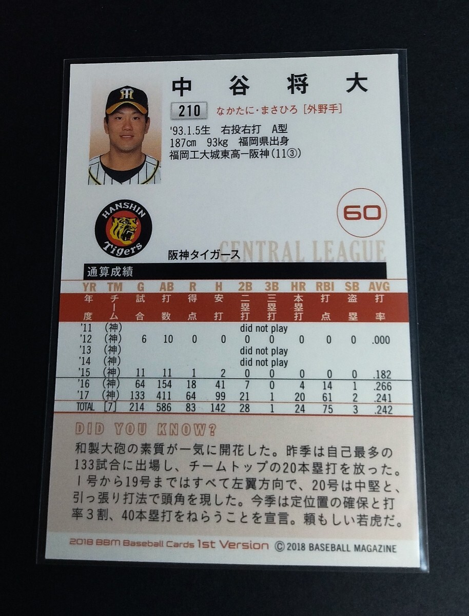 2018年BBM 1st 中谷将大(阪神)シークレット版。銀箔サイン入り。No,210。
