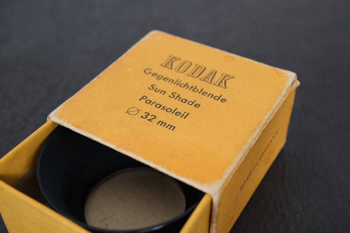 KodakRetinaシリーズ用レンズフードです。フード内径32mmなのでEktar 47mmにも装着可能なカブセ式フードです。使用感はありません。希少な純正外箱付。