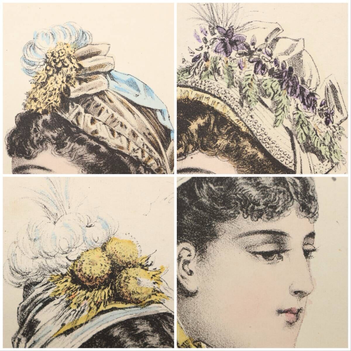 まだ写真が普及していなかった時代に当時のフランスの上流階級の婦人向けの雑誌やカタログの挿絵としてエングレーヴィング(銅版画)のモノクローム印刷に職人たちがやわらかな手彩色を施しました。