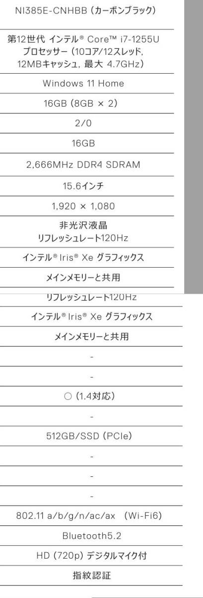 | 商品説明 | デル DELL 15.6型ノートパソコン NI385E-CNHBB(NI385-CNHBCB) [Inspiron 15 3520/Core i7-1255U/メモリ 16GB/SSD 512GB/ リフレッシュレート120Hz/Iris Xe グラフィックス/Windows 11 Home/ Office Home & Business 2021/カーボンブラック] です。 国内大手家電量販店(正規販売代理店)購入の新品未開封品です。 メーカー保証書未記入に販売店保証明細付属。 即決です。消費税はかかりません。 2025年9月から3年保証付。在庫ラストになります。 NI385E-CNHBB(カーボンブラック)は 一般の市販モデルNI385-CNHBCB(カーボンブラック)の 量販店オリジナルモデルと思われます。スペックは同じです。 オリジナルモデルの方は標準でメーカー3年保証が付きます。 (店舗保証書=3年保証) *DELL製品にはメーカー保証書が添付されていません。 (DELL製品共通。どの量販店も共通です) 購入店の保証明細用紙(=店舗保証書)が必要となりますので大切に保管してください。 付属の保証書冊子にサービスタグコードの空欄や店舗保証書を添付する空欄があります。 ◆製品 ■あなたに、明日のひらめきを。 パワフルな第12世代インテル Core i7 プロセッサーと 高速処理をかなえるSSDの組み合わせが、 応答性と静音性を両立したパフォーマンスを発揮します。 インテル Iris Xe グラフィックス搭載。 ■リフレッシュレート120Hzパネル採用 滑らかな映像を表示できるリフレッシュレート120Hzのパネルを採用し、 動画コンテンツなどをより快適に視聴できます。 ■快適なディスプレイ表示 ディスプレイは3辺フレームレス ディスプレイを採用しており、 FHDの臨場感を堪能できます。 また、ComfortView Low Blue Light(LBL)ソリューションにより、 有害なブルーライトの放出を抑え、長時間の使用でも目の負担を軽減します。 ■生産性を向上させるSSD搭載 高速処理をかなえるPCIe接続のSSD搭載により、 OSやアプリの超高速な起動と応答性、全体的なパフォーマンスを向上します。 ■ご購入後も安心のDell プレミアムサポート ハードウェアとソフトウェアともに 国内のDell製品専任担当者が24時間365日サポートするので安心です! 例えばパソコンの調子が悪い、インターネットへの接続の方法が解らないなど お客様がお困りの時にご相談ができます。 修理が必要な場合は専門エンジニアによる翌営業日出張修理も可能です! 【仕様】 ●OS :Windows 11 Home ●CPU :第12世代 インテル Core i7-1255U プロセッサー (10コア/12スレッド 12MBキャッシュ 最大 4.7GHz) ●メモリ:標準16GB(最大16GB) ●ストレージ容量 :SSD 512GB(PCIe) ●表示機能:15.6インチ 非光沢液晶(リフレッシュレート120Hz) ・表面仕様:ノングレア ・解像度:1,920×1,080 ●グラフィックス機能:インテル Iris Xe グラフィックス ●Webカメラ:HD(720p)デジタルマイク付 ●メディアスロット:SDカードリーダー(SD、SDHC、SDXC) ●内蔵無線LAN:802.11 a/b/g/n/ac/ax(Wi-Fi6) ●Bluetooth:Bluetooth5.2 ●USBポート数:USB 2.0x1、USB 3.2x2 ●ディスプレイ出力:HDMI(1.4)×1 ●サウンド入出力:ヘッドフォン・マイク×1 ●日本語版キーボード(テンキー付き) ●Windows Hello対応(指紋認証) ●バッテリー駆動時間:約6.5時間 ●本体寸法 幅×奥行き×高さ(mm):359×236×16.9~21.0 ●質量:約1.6kg~ ●Officeソフト:Office Home&Business 2021 ◆詳細はメーカーサイトで確認して下さい ・メーカーカタログ(PDFファイル15ページ目の左側、カタログのP.28に 本製品NI385E-CNHBBのスペック欄があります。 同様にPDFファイル7ページ目、カタログのP.12とP.13に 本製品NI385E-CNHBBの製品ページがあります。) https://www.edion.com/download/4580691199680.pdf *** 『あなたがアクセスしようとしているリンク先は Yahoo! JAPANのサイトではありません。 IDやパスワードを要求するサイトにご注意ください。』 と表示されますが、気にしないでください。 リンク先は個人のサイトではなくメーカーサイトです。 |