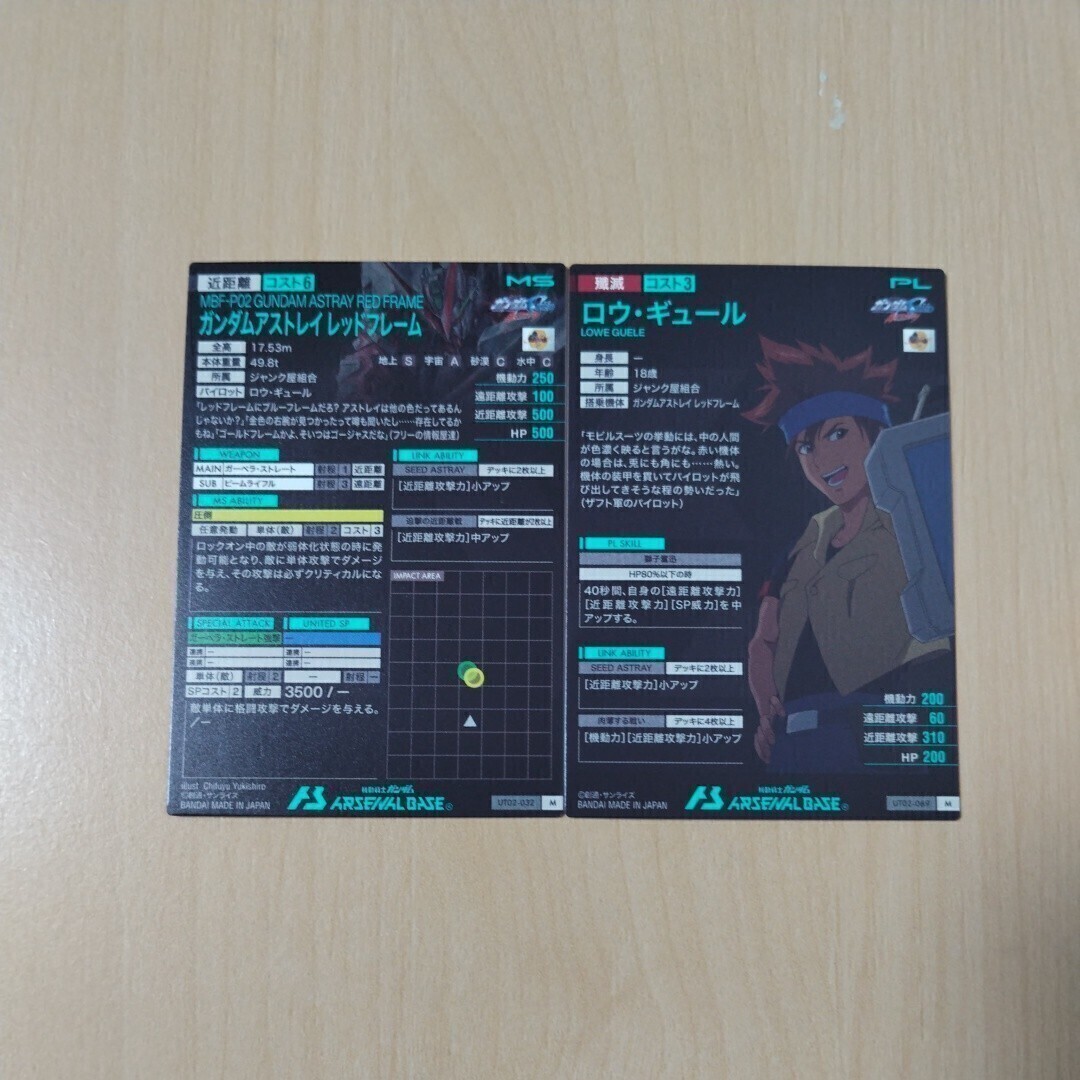 ガンダムアーセナルベース、Mレア、ガンダムアストレイレッドフレーム & ロウ・ギュールの出品となります。未使用品です。排出後、スリーブに入れて保管していますが初期キズなど気になさる方はご遠慮ください。配送料金は梱包代込みで全国一律、120円とさせていただきます。他の出品との同梱は対応いたします。ノークレム、ノーリターンにてお願いいたします。