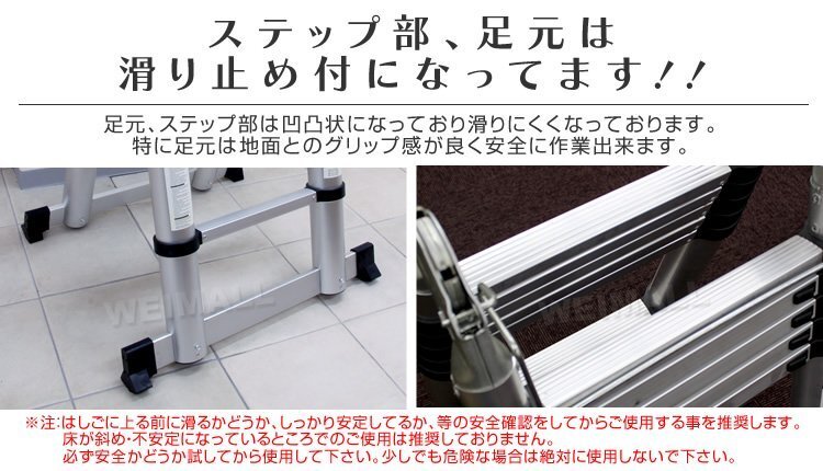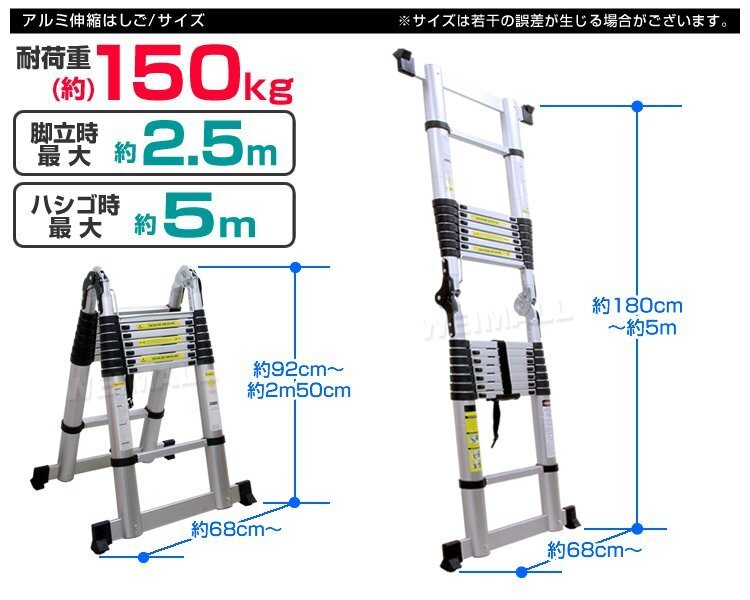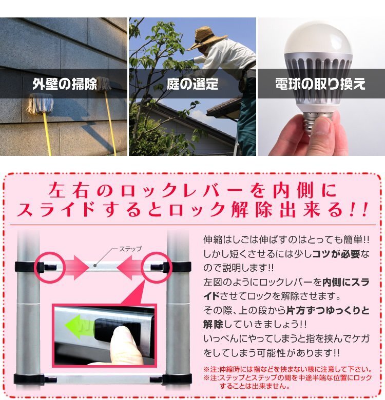 | 最長5mまで伸びるはしご。 伸縮自在で使用時には1段ずつの引き伸ばし可能! 必要な高さでロックできます。 収納時の高さはなんと87cm! 軽自動車でも運べるコンパクトサイズ! 2階の外壁、窓、屋根のお掃除はもちろん、電球交換など幅広く活躍! 私生活に不可欠なはしごです! 段落ちしない安全ロック付。 ■商品コード:ABK01050 ■商品仕様 最長:500cm(脚立時:250cm) 収納時:92×68cm 質量:18kg 最大耐荷重:150kg 素材:アルミ(連結部分:スチール) ■注意事項 ・商品の重量が重く、ケガを防止するためにも、2人以上での作業をされますようお願い致します。 ・ロック状態を確認した上でのご使用をお願い致します。 ・天板部分に乗ってのご使用は危険な為、お止め下さい。 ・足元が不安定な場所などでのご使用はお止め下さい。 ・海外からの輸入製品のため、製造または配送の過程において生じた細かなキズやへこみが見られる場合がございますが、 機能性や品質上に問題はないため、返品や交換の対象とはなりません。予めご了承の上、ご購入をお願いいたします。 ・商品を使用して発生した事故・トラブル・破損等につきましては一切の責任を負いかねます。 ・商品は、モニターによって色合いが異なって見える場合があります。 ・仕様・デザインは改良のため予告なく変更することがあります。 【もちろん新品未使用品です】 |