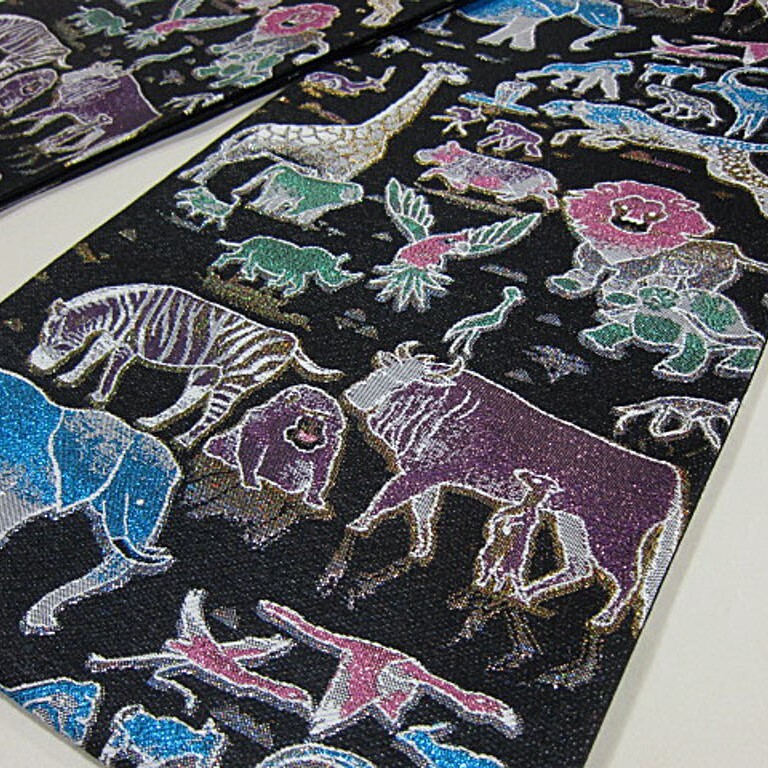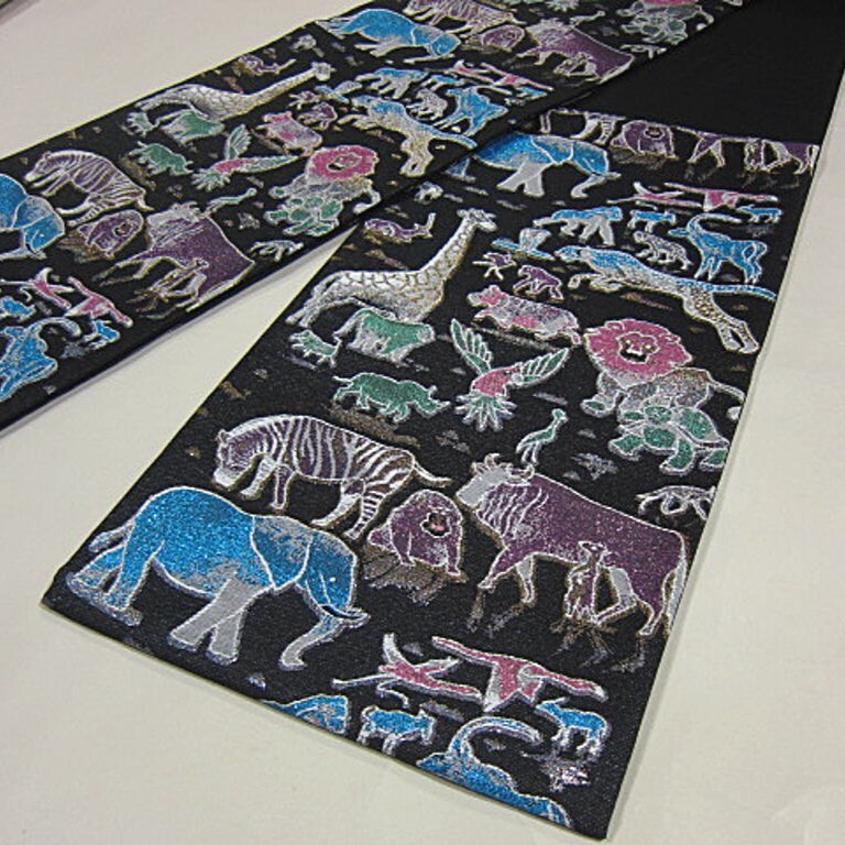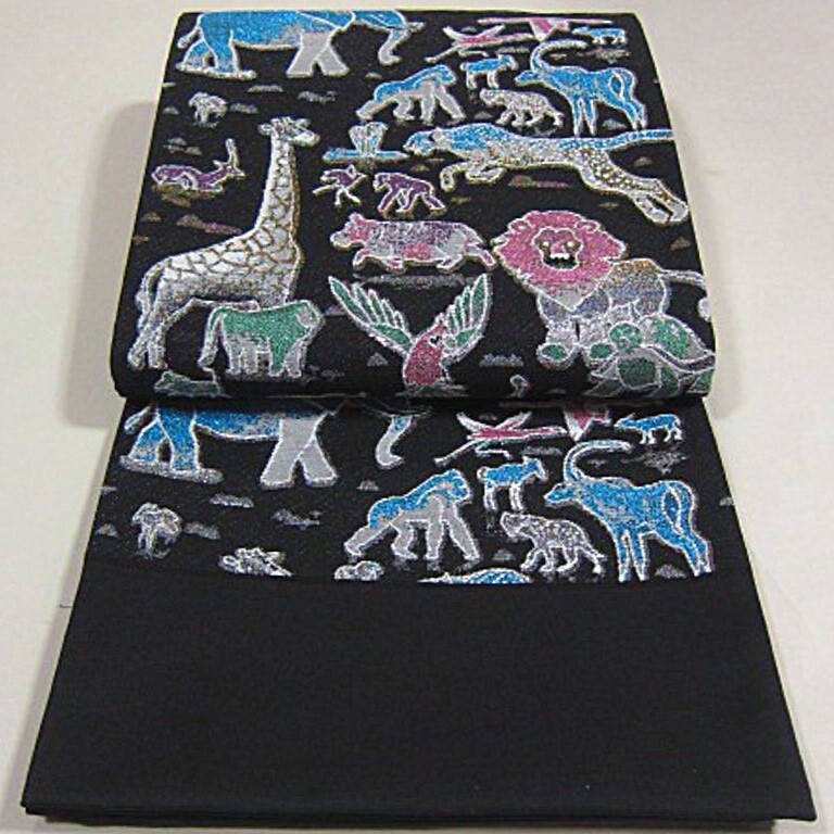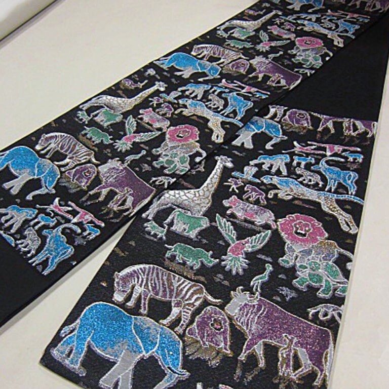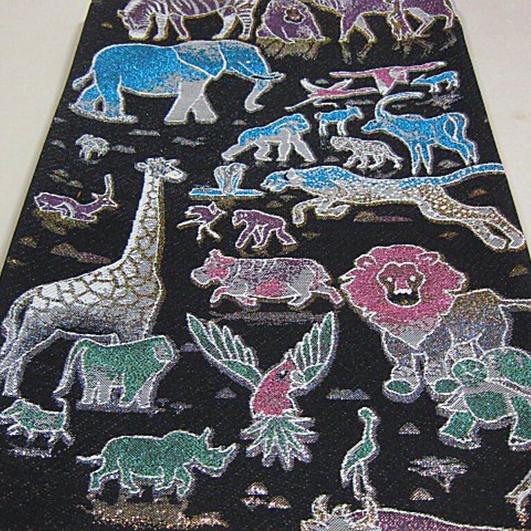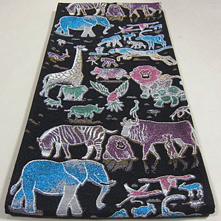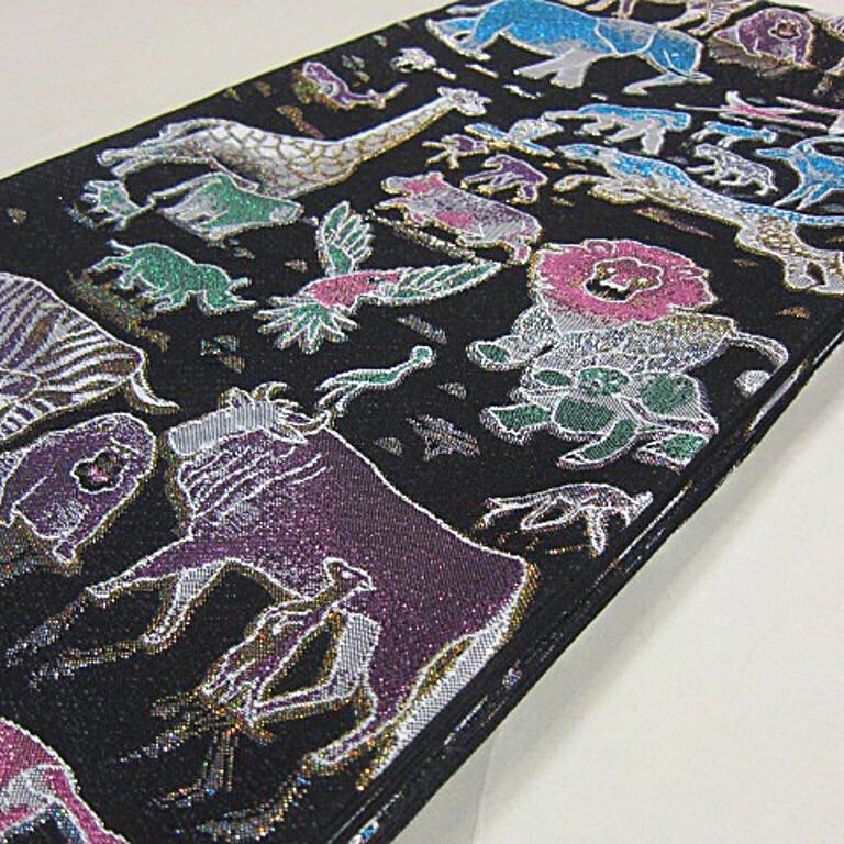 新柄 新品未仕立 西陣織高級六通柄袋帯 サファリ 動物 ゾウ キリン ライオン 黒地