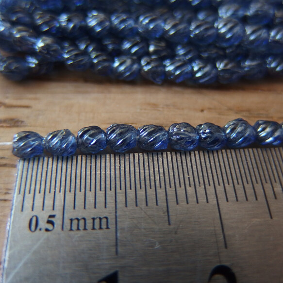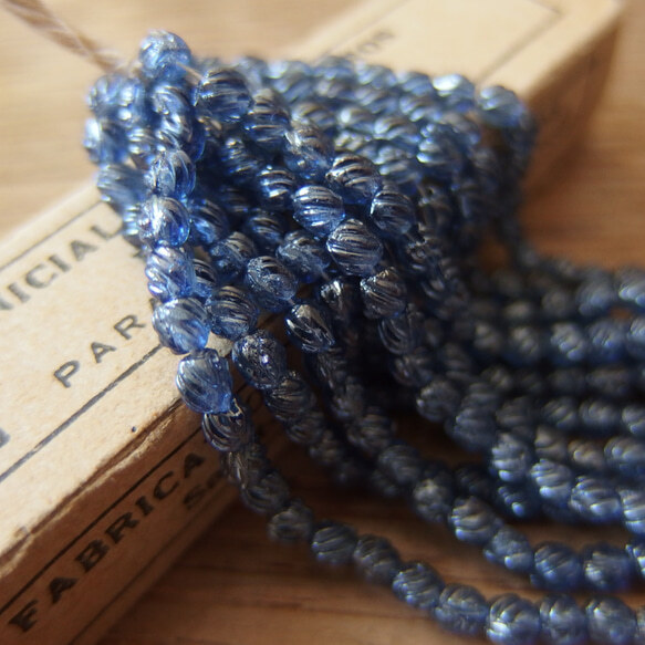 フランスの古いビーズ、直径約3ミリ強のうっすらラスターがかったひねり模様のクリアな青、1連分45個です。画像は12連です。