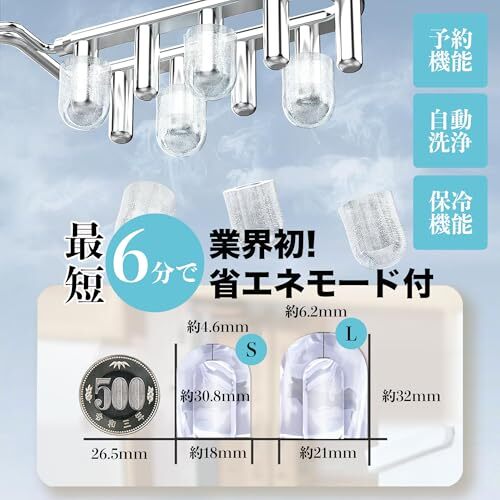 【2サイズ氷選択&3モード切替】急速モードでは小さめの氷(18*4.6*30.8mm)を作成し、飲み物を素早く冷やします。標準モードでは大きめの氷(21*6.2*32mm)を作成し、溶けにくいので飲み物を長く冷たい状態に保ちます。省エネモードでは低消費電力で経済的です。