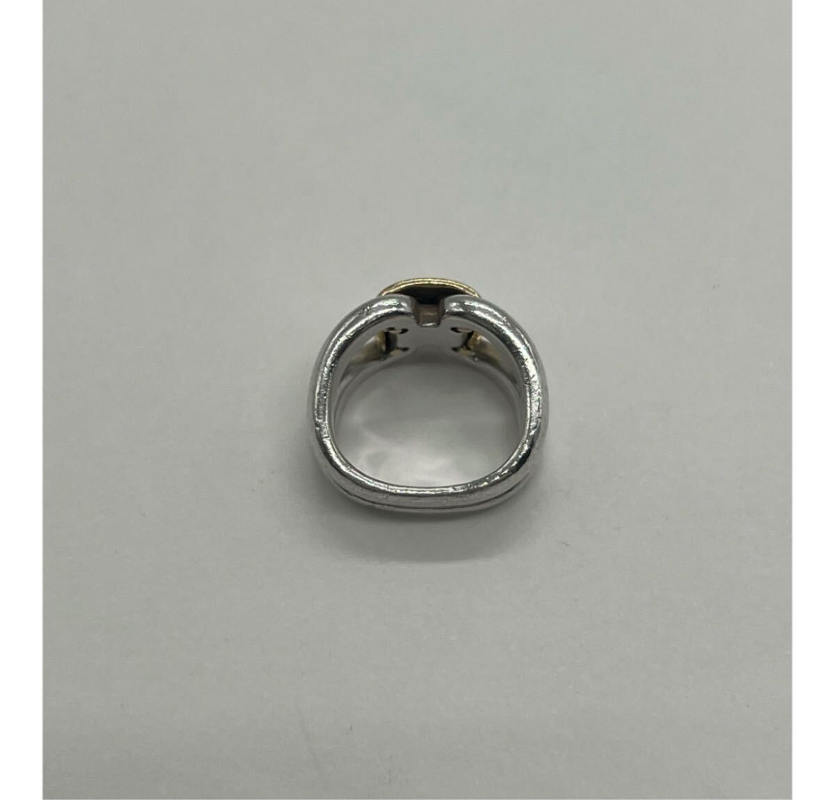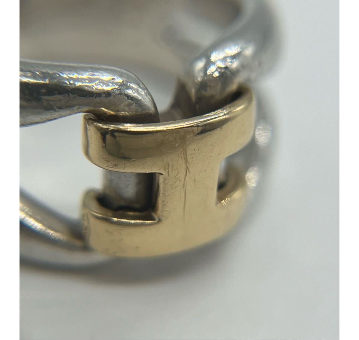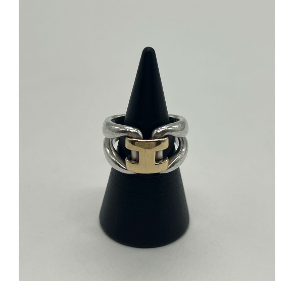 デザイン性のあるシルバーのリングにHロゴがゴールド素材で配置されたリングで重厚感と上品さを兼ね備えた印象のリングでございます。
