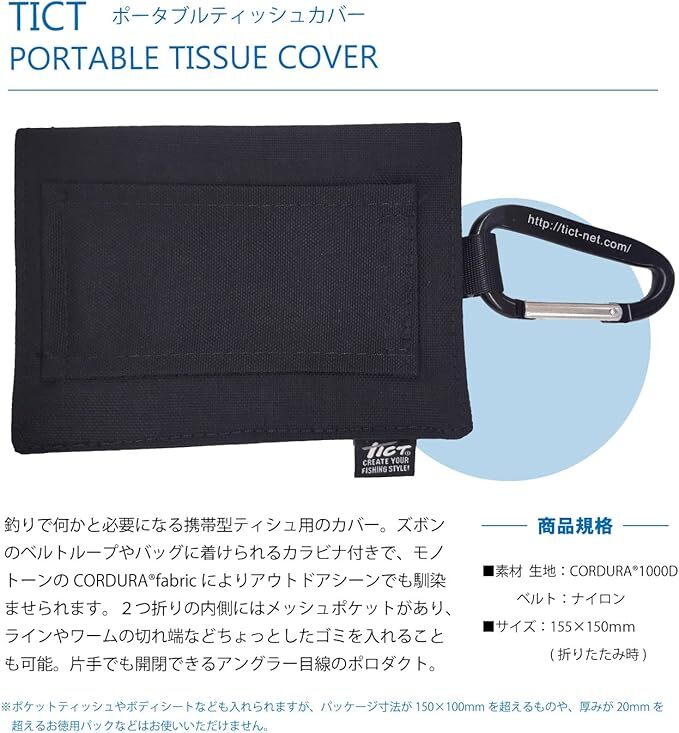 釣りで何かと必要になる携帯型ティッシュ用のカバー。 ズボンのベルトループやバッグに着けられるカラビナ付きで、モノトーンのCORDURA(R)fabricによりアウトドアシーンでも馴染ませられます。
