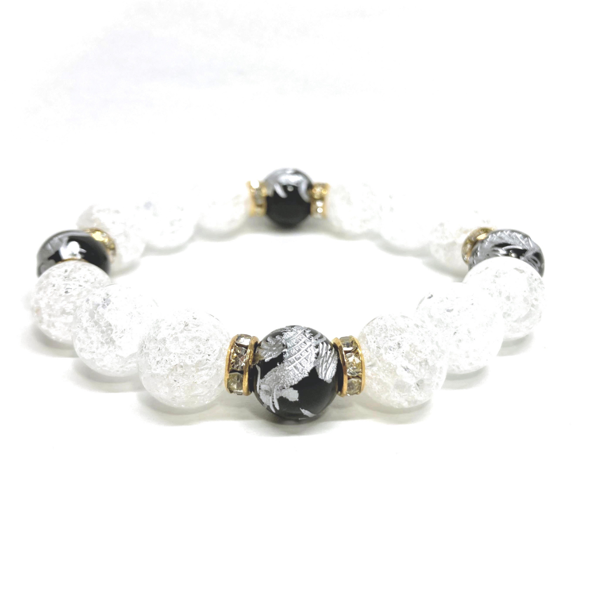 こちらは、四神獣銀彫オニキとクラック水晶を組み合わせたパワーストーンブレスレットです。四神獣は、中国の伝説で4つの方向(東西南北)を守護する神聖な神。四神獣、厄災から身を守り、多くの運気を呼び込むと言われております。石大きさは程よくインパクトのある12mm玉で内周 約17cmです。 数に限りがございますので気になる方はお早めにどうぞ。