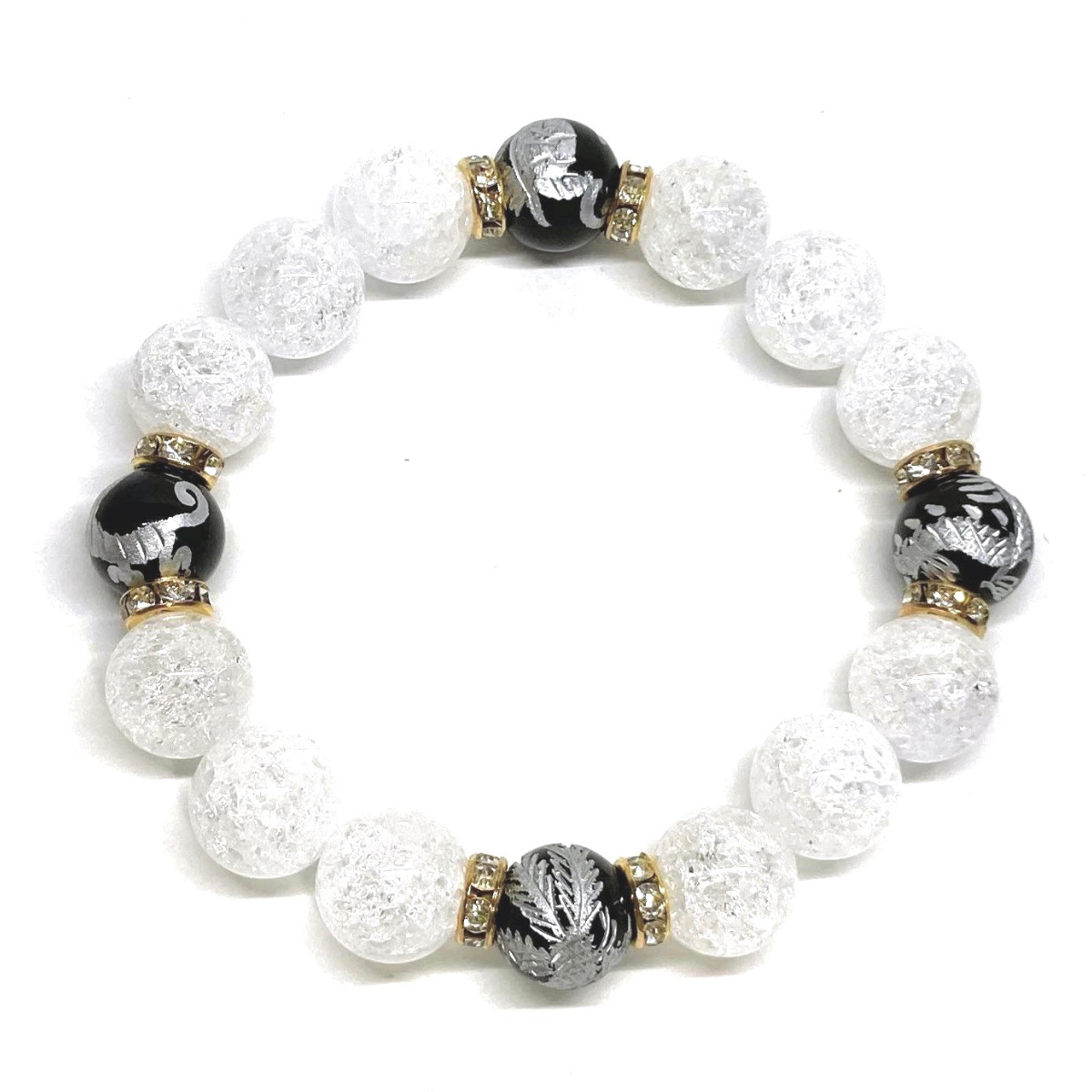 四神獣銀彫オニキス×クラック水晶 12mm パワーストーン ブレスレット天然石 青龍 白虎 玄武 朱雀 運気上昇 開運 金運 お守り 四神相応 G